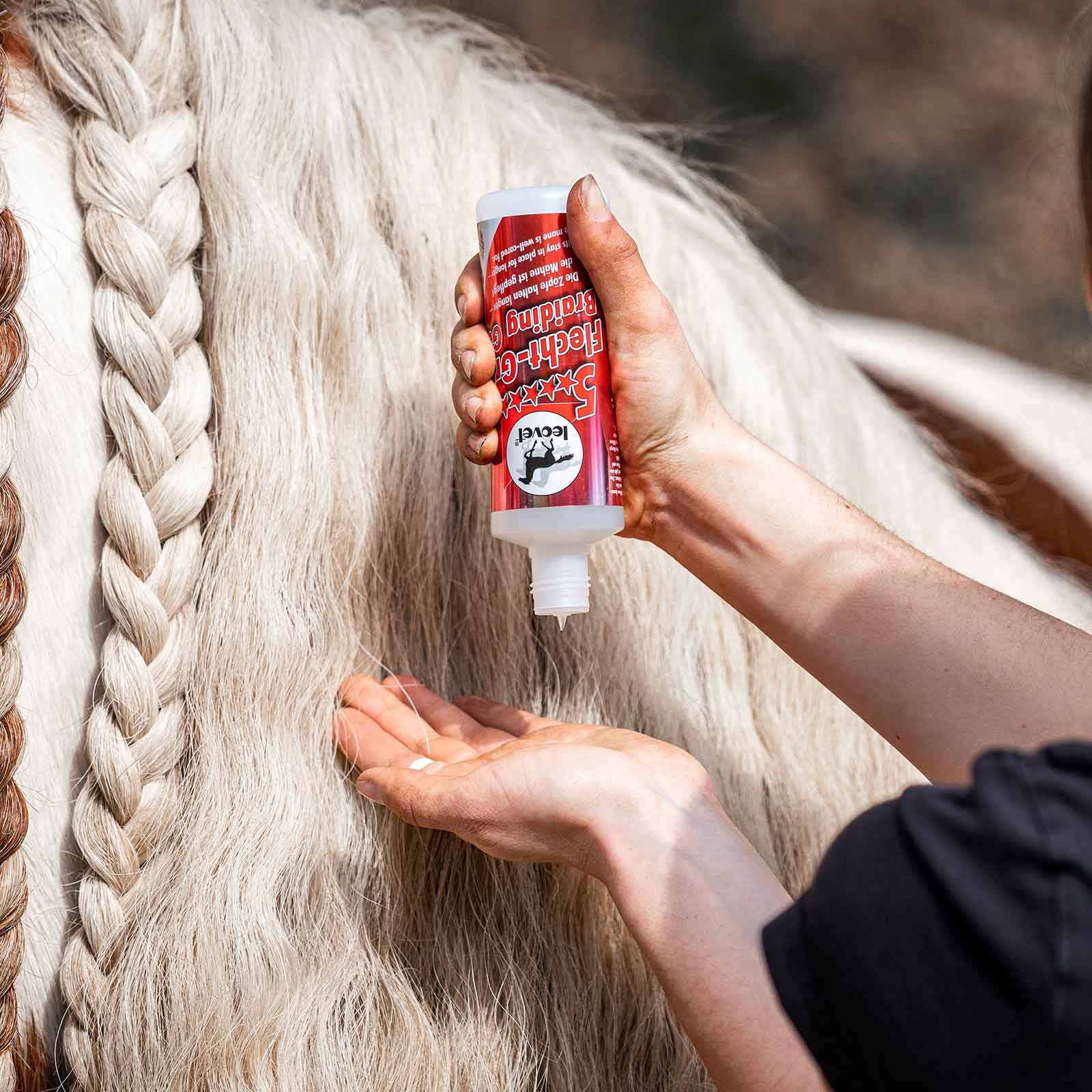 A kifejezetten a sörényhez tervezett 5-Star fonat-gél megkönnyíti a sörény és a farok befonását. A Leovet 5-Star fonat-gél kibogozza, ápolja a sörényt és biztosítja a szükséges tartást a sörény és farok befonásához. Az optimális tapadásnak köszönhetően a fonat tovább tart, és elkerülhető a csúnya szétesés. Ez már megkönnyíti az egyes szálak szétválasztását, és hosszú időre tökéletes copfokba rögzíti őket. A Leovet 5-Star fonat-gél természetesen szilikonmentes.