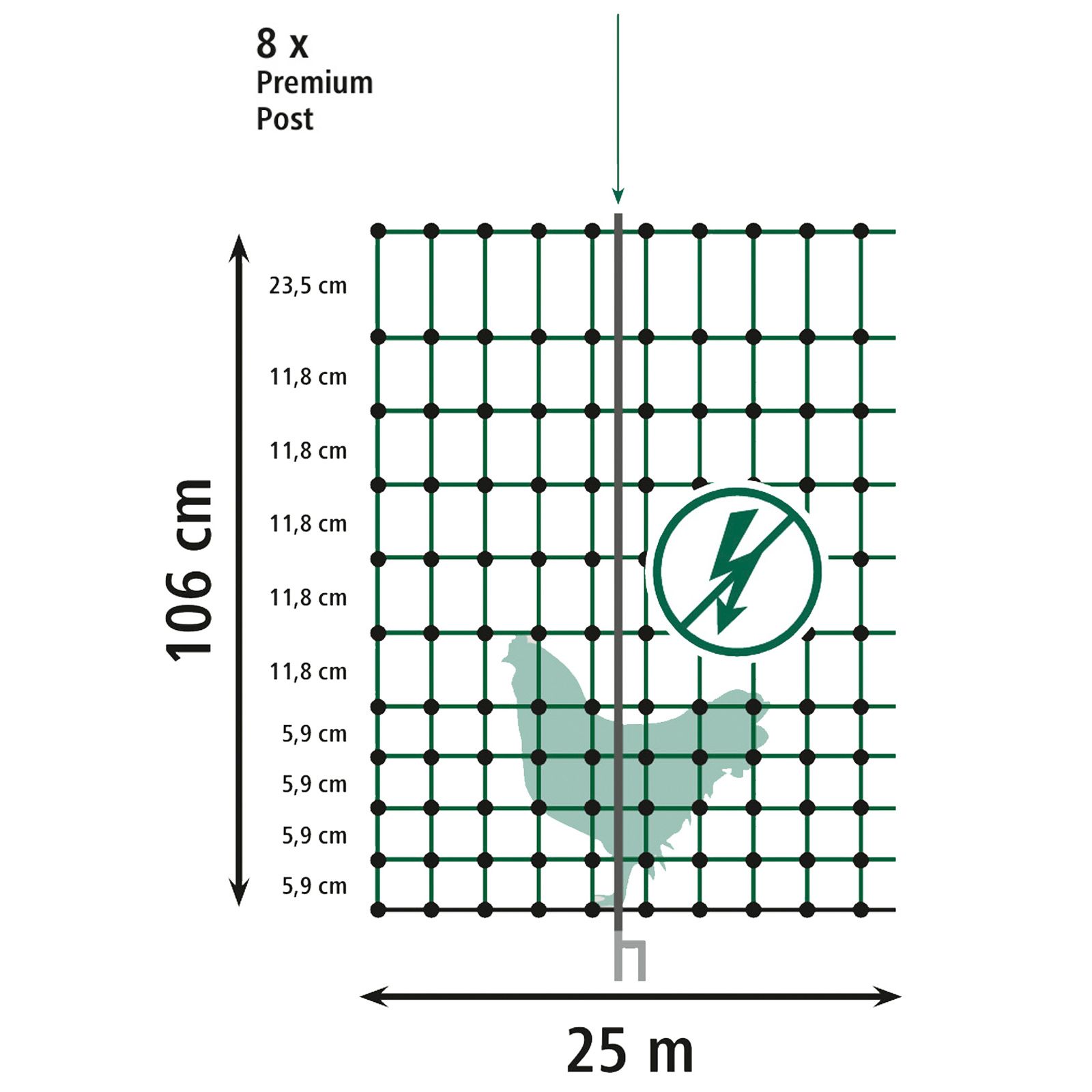 1x Premium csirkeháló, nem villamosítható, dupla földtüskével, zöld 106 cm (25 m vagy 50 m, modelltől függően)