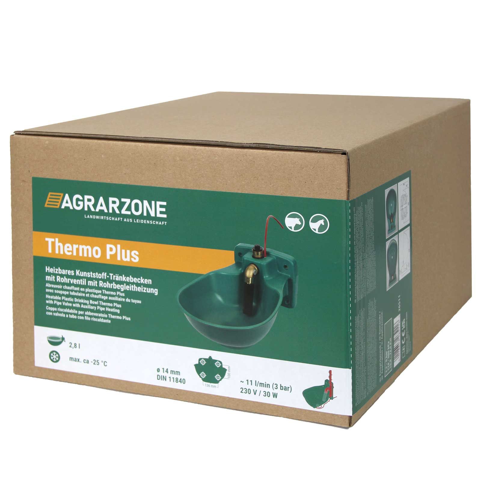 Az Agrarzone 230 voltos fűtött itatóvályúja alkalmas a keringető fűtési rendszerekhez, és akár 11 liter/percig szabályozható vízáramlással rendelkezik. Fent és lent ½ hüvelykes csatlakozóval rendelkezik, és könnyű cső- vagy falra szerelhetőséget ígér. A csőszeleppel ellátott önitató leeresztő dugóval van ellátva az egyszerű és gyors tisztítás érdekében. Az itató törés- és ütésálló műanyagból (PP) készült, így nagy igénybevételre is alkalmas.