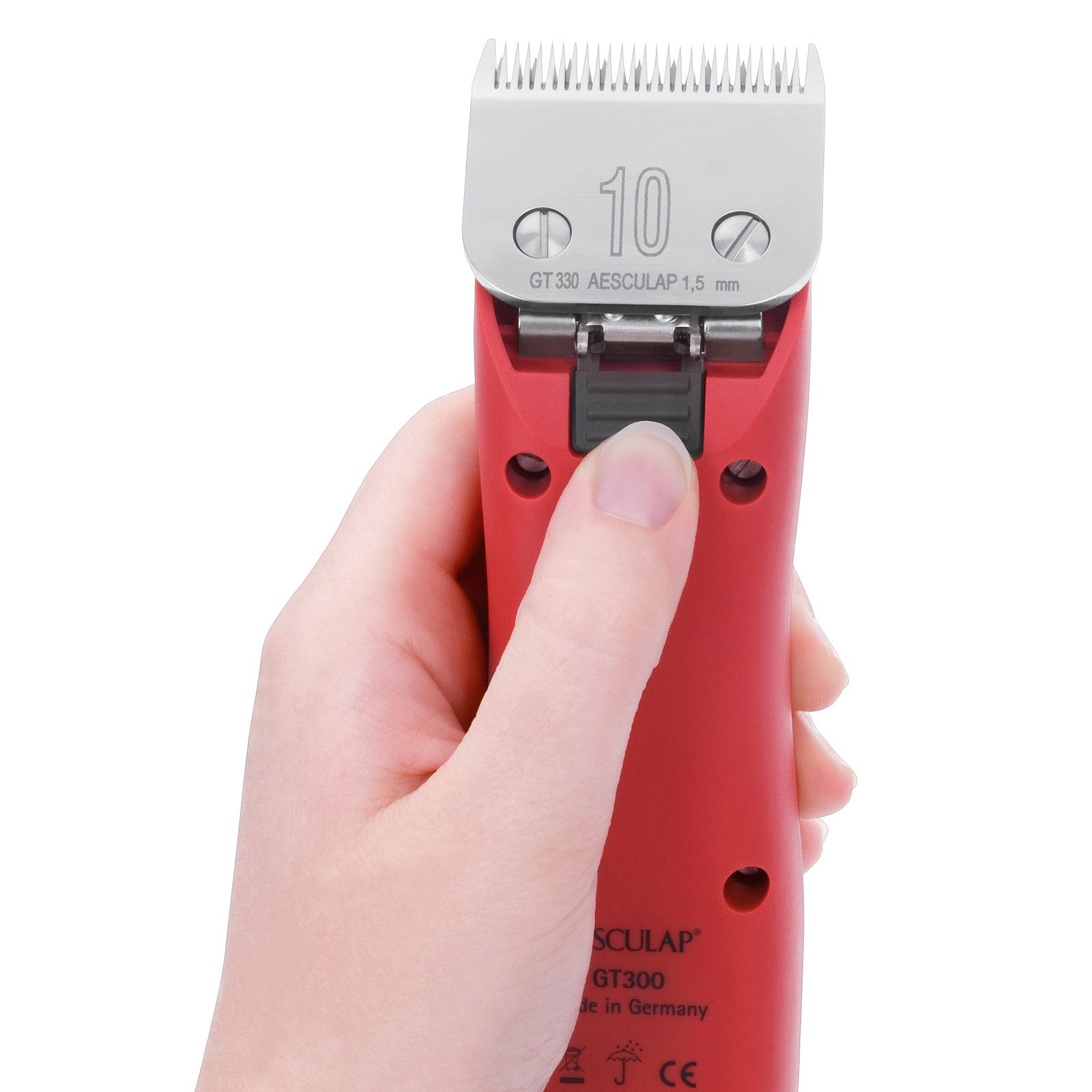 Az akkumulátoros nyírógép másik különlegessége a különösen ergonomikus, vékony, törhetetlen speciális műanyagból készült ház. A jól átgondolt kialakítás lehetővé teszi a fáradságmentes vágást. A jól hangolt szellőztető rendszer véd a túlmelegedéstől és hosszú élettartamot biztosít. A mellékelt GT330 #10 nyírófej tökéletesen kiegészíti az Aesculap FAV5 CL-t. Az 1,5 mm-es nyírókészlet rövid szőrzethez alkalmas, és pontos, tiszta vágással nyűgöz le. A rozsdamentes acélból készült, 5 felpattintható fésűből álló toldófésű-készlet könnyen siklik a szőrzetben, és egyenletes és optimális vágási mintázatot biztosít a különböző vágási hosszúságoknál.