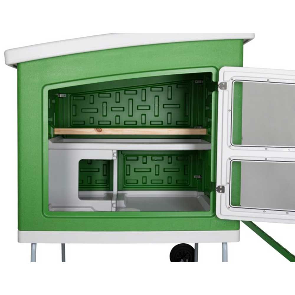A Mobile Coop tyúkólhoz tartozik egy csirkelétra és egy ülőke, amelyen tollas barátai szívesen ülnek majd. Az ülőkék alatt található ürüléktálca biztosítja, hogy ne kelljen minden nap cserélni az almot ezen a területen. Az ürüléktálca egy oldalsó nyíláson keresztül könnyen és gyorsan kihúzható a tisztításhoz. A lekerekített ülőkékkel ellátott, sötétített tojófészekben a tyúkok nyugodtan költhetnek. A tojófészek kívülről történő megnyitása lehetővé teszi a tojások gyors eltávolítását.