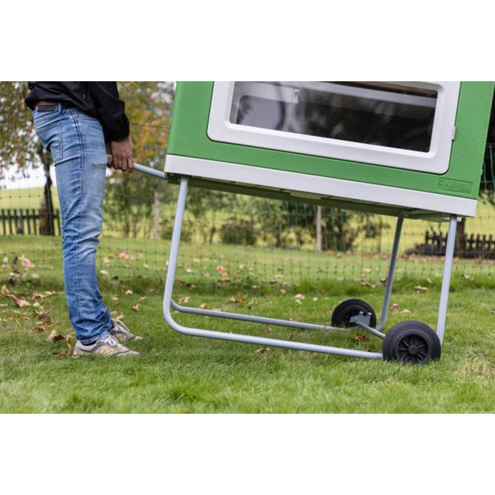 A Mobile Coop csirkeólt mobil használatra tervezték. A nagyon stabil fémkeret két kerékkel és egy oldalsó fogantyúval megkönnyíti a csirkeház felemelését és mozgatását. A kiváló minőségű, tartós csavarokkal és szerelvényekkel ellátott, nagyon robusztus és innovatív konstrukciónak köszönhetően a csirkék számára állandó otthont biztosít. A duplafalú elemeken keresztüli jó szigetelés nyáron kellemesen hűvösen tartja a mobil tyúkólt, télen pedig csökkenti a hőveszteséget.