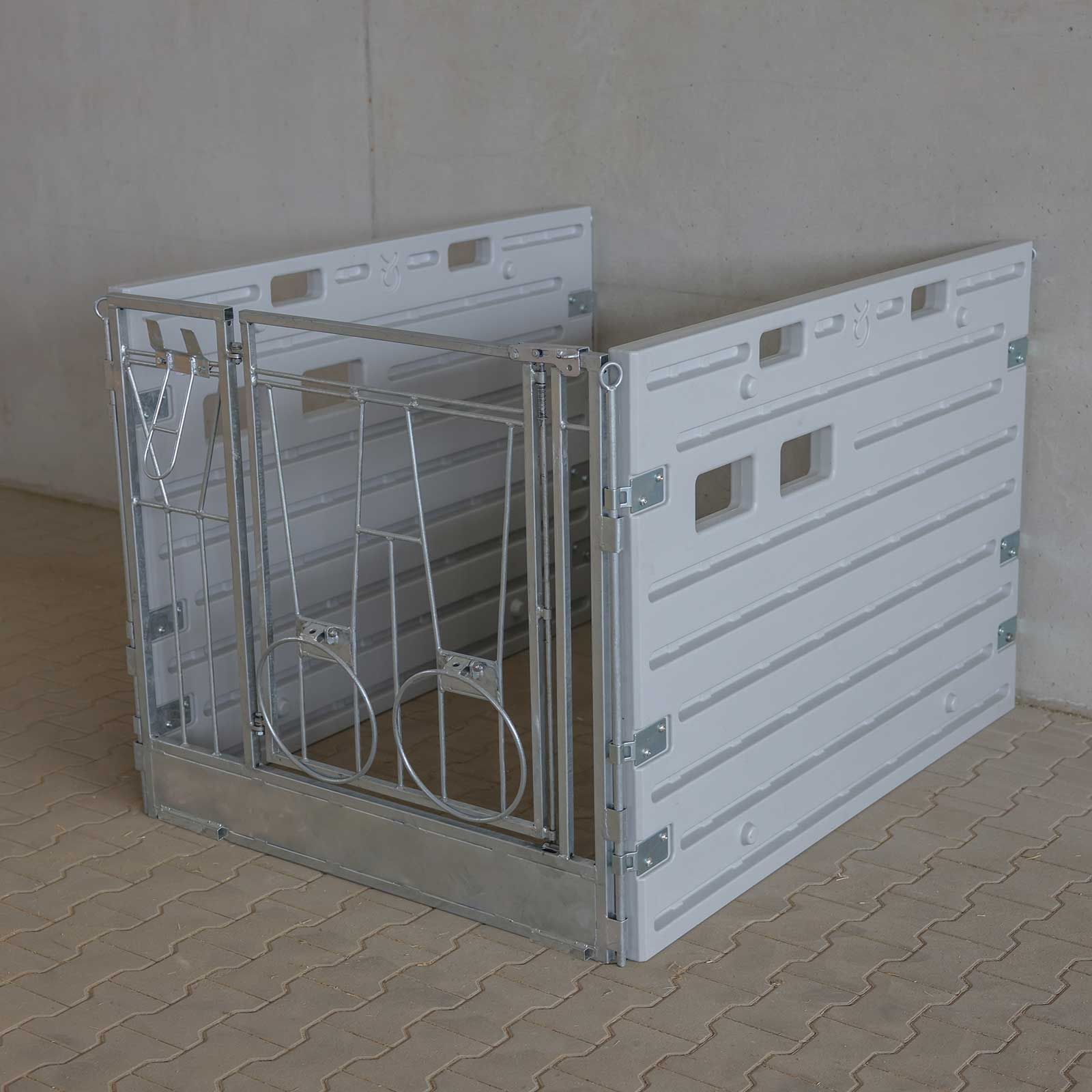 Ez a moduláris borjúbox single box a falon használható, és egy személy számára gyorsan és egyszerűen felállítható. A 2 oldalsó panel és az elülső elem könnyedén összekapcsolható, így szükség esetén gyorsan létrehozható az egyetlen borjúbox.