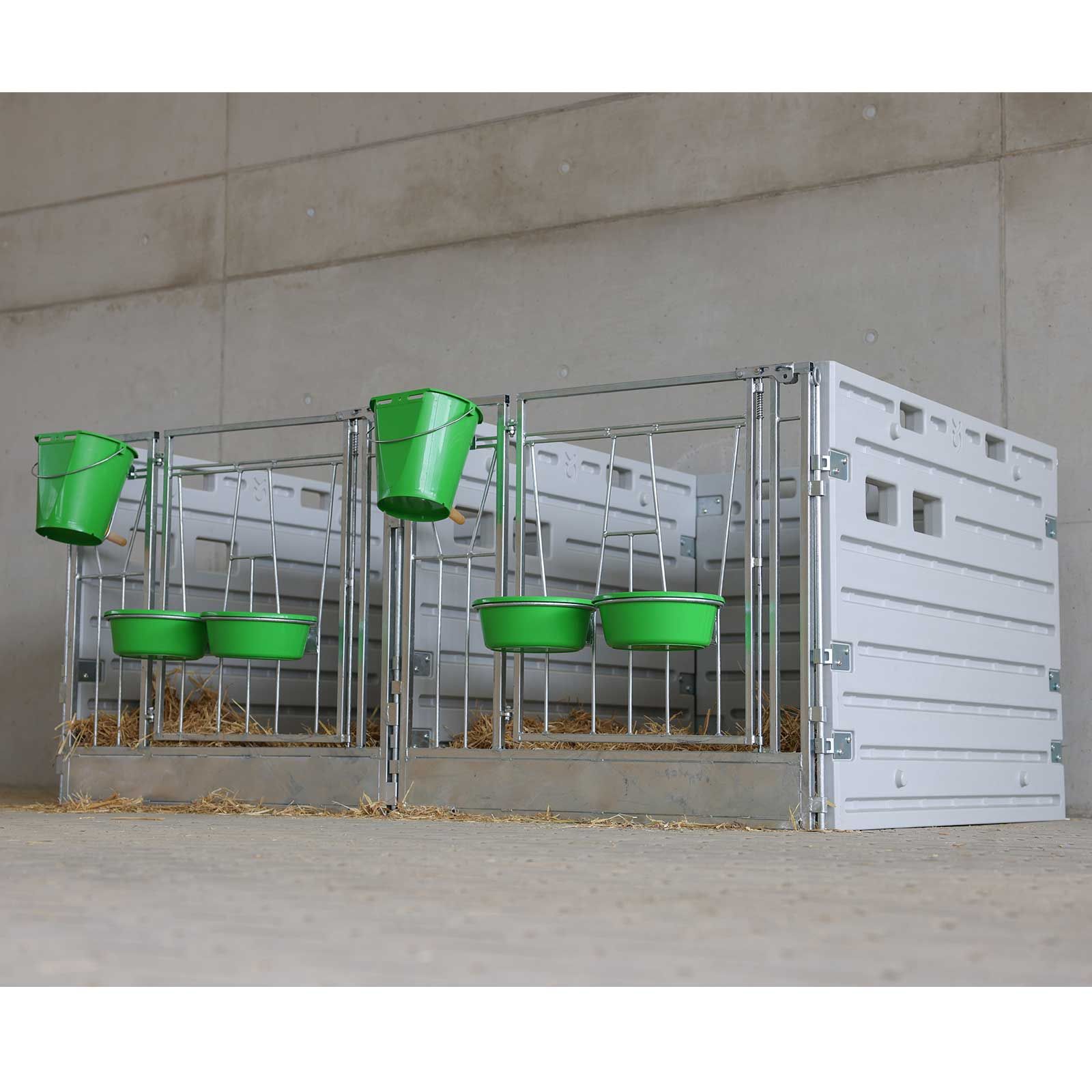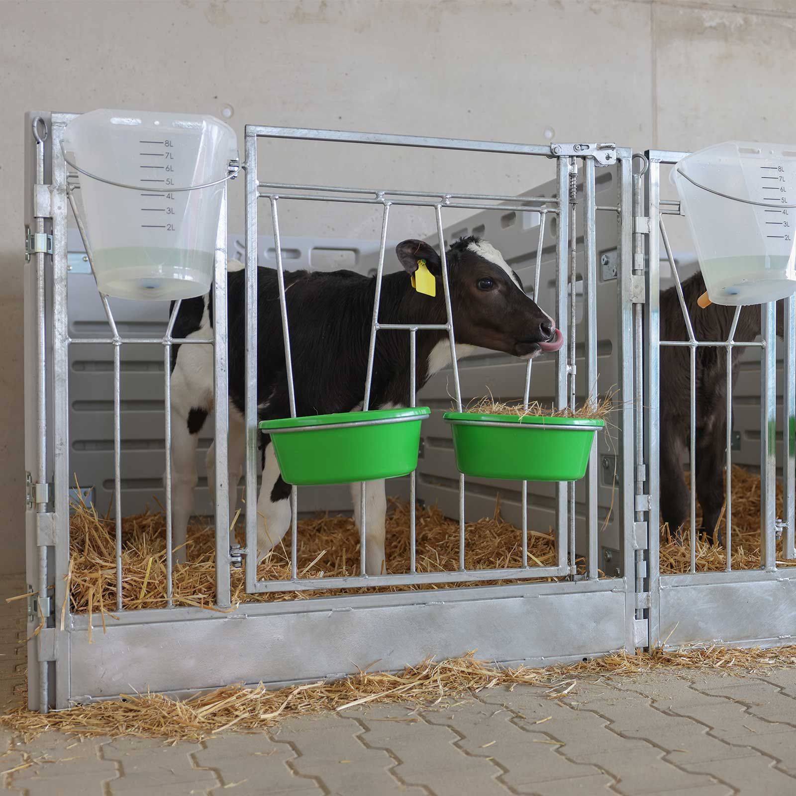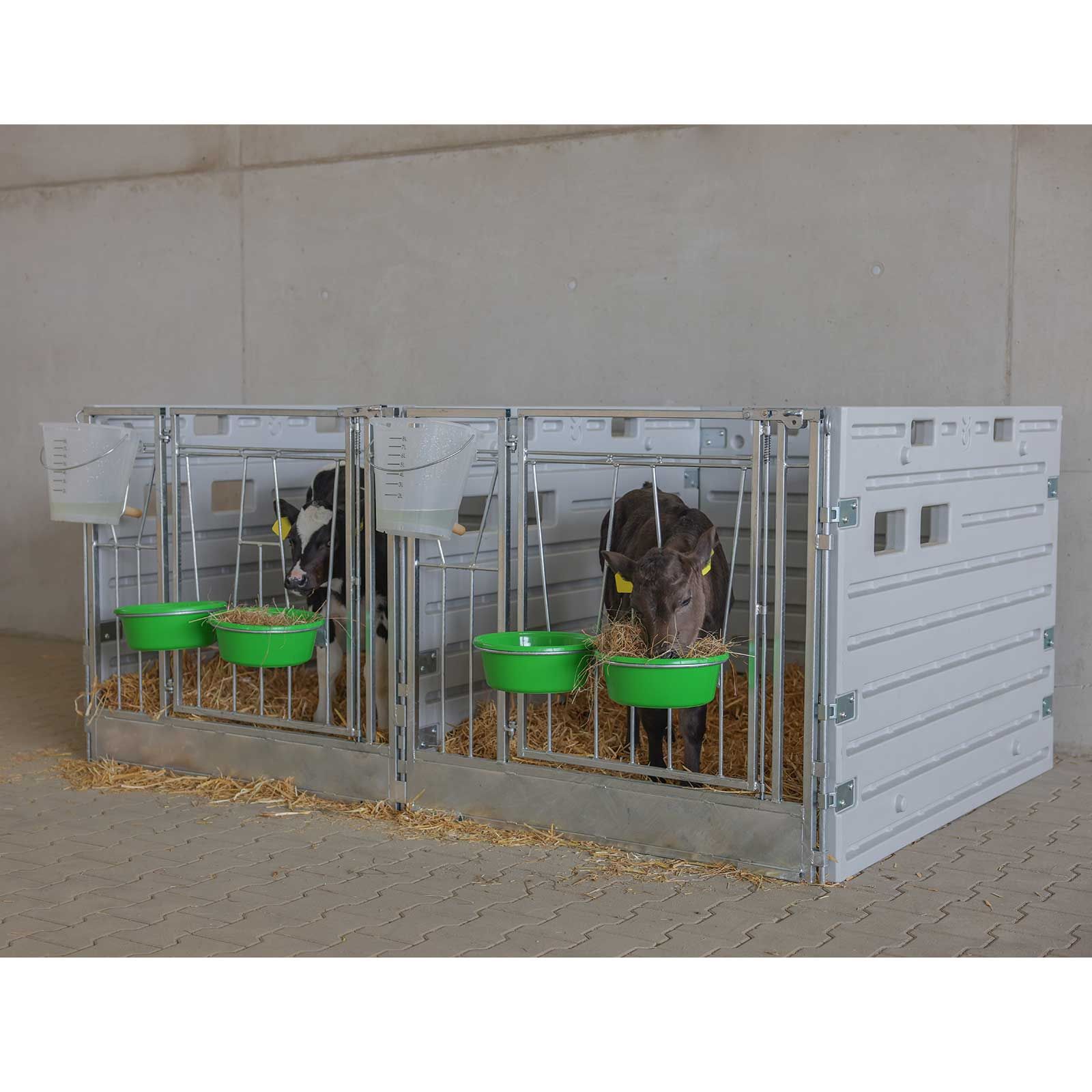 A dupla borjúbox oldalfalai szociális érintkezési nyílással vannak ellátva, amely lehetővé teszi, hogy a borjú kapcsolatba léphessen más borjakkal. Az elülső elemek egy átfordítható forgóajtóval és egy fix itatóval rendelkeznek, amely ideális a borjak szopós itatóra való neveléséhez. A két borjúkarám egy-egy itatóvödör-tartóval és két összecsukható vödör-tartóval is fel van szerelve.