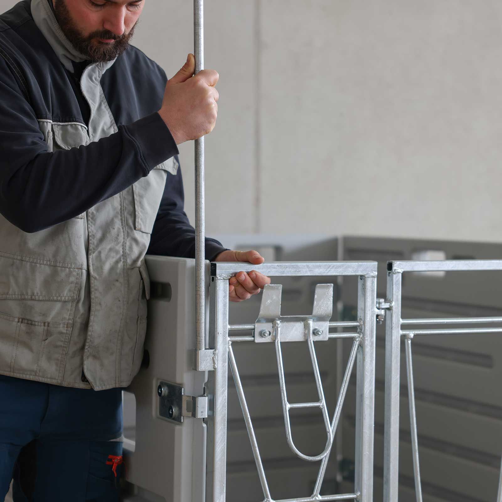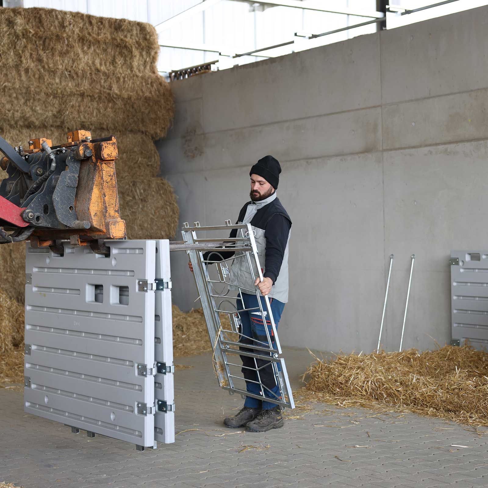 A moduláris dupla borjúbox összeszerelése és szétszerelése ugyanolyan egyszerű, mint amilyen gyors. A panelek fogantyúi elég nagyok ahhoz, hogy raklapvillára lehessen őket sorakoztatni. Az egyedülálló rakodási rendszer lehetővé teszi a panelek helytakarékos rendezését és tárolását, beleértve az ajtóelemet is.
