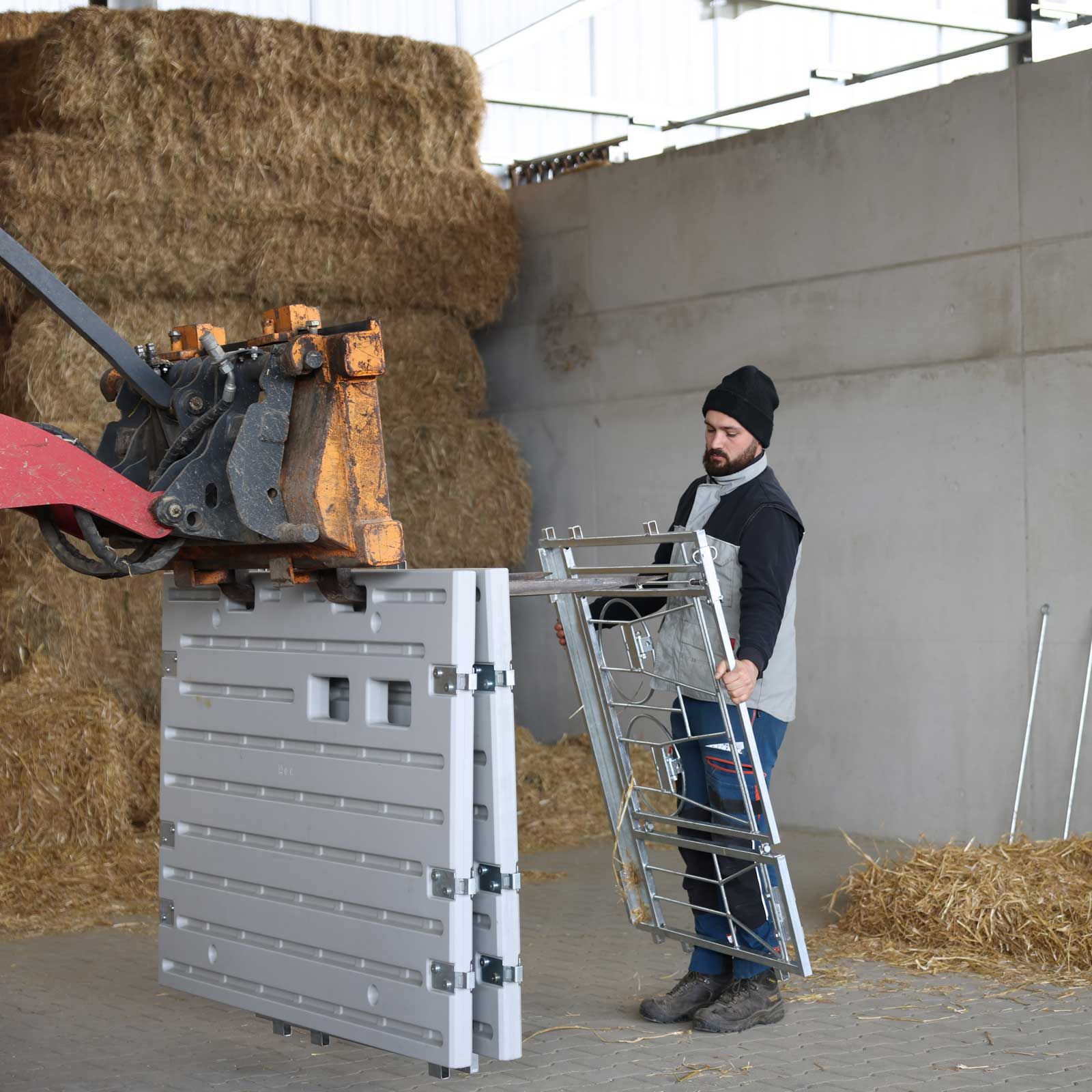 A moduláris dupla borjúdoboz összeszerelése és szétszerelése egyszeru és gyors. A paneleken található nagyméretu fogantyúk alkalmasak a következokre is Szállításra egyRaklapvillával. A egyedi rakodási rendszer lehetové teszi a panelek helytakarékos válogatását és tárolását, beleértve az ajtóelemeket is.