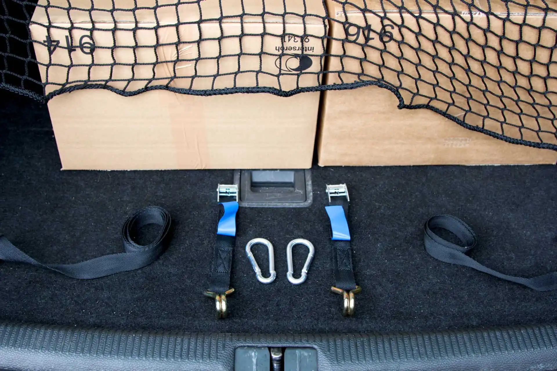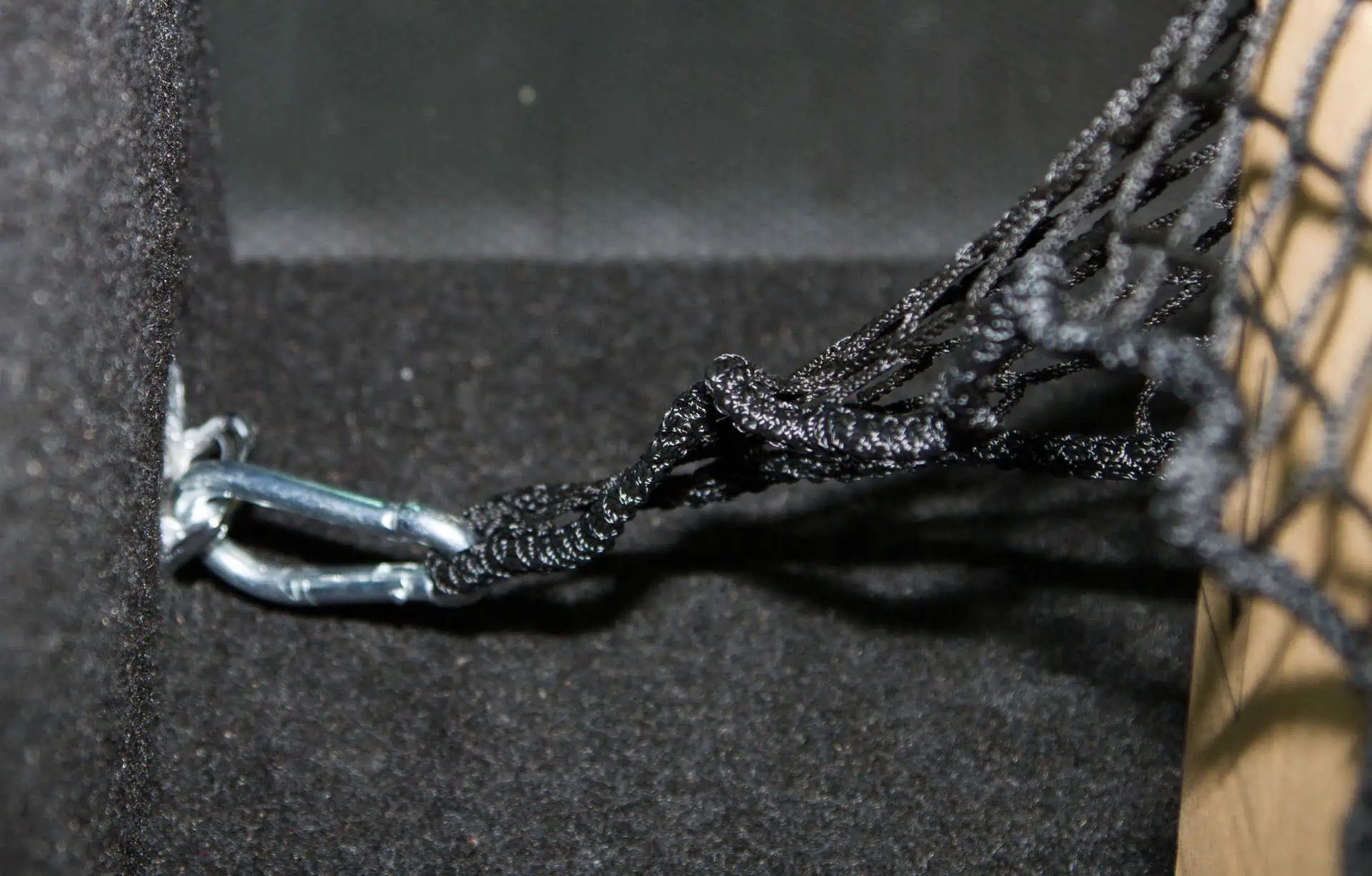 - A szállítás 2 karabiner kampót és 2 hevedert tartalmaz: A heveder egyik vége a háló PES húzózsinórjaihoz van rögzítve szorítózárak segítségével, a heveder másik vége pedig hegyes rögzítőelemekkel van rögzítve a jármű rögzítési pontjaihoz. horgok