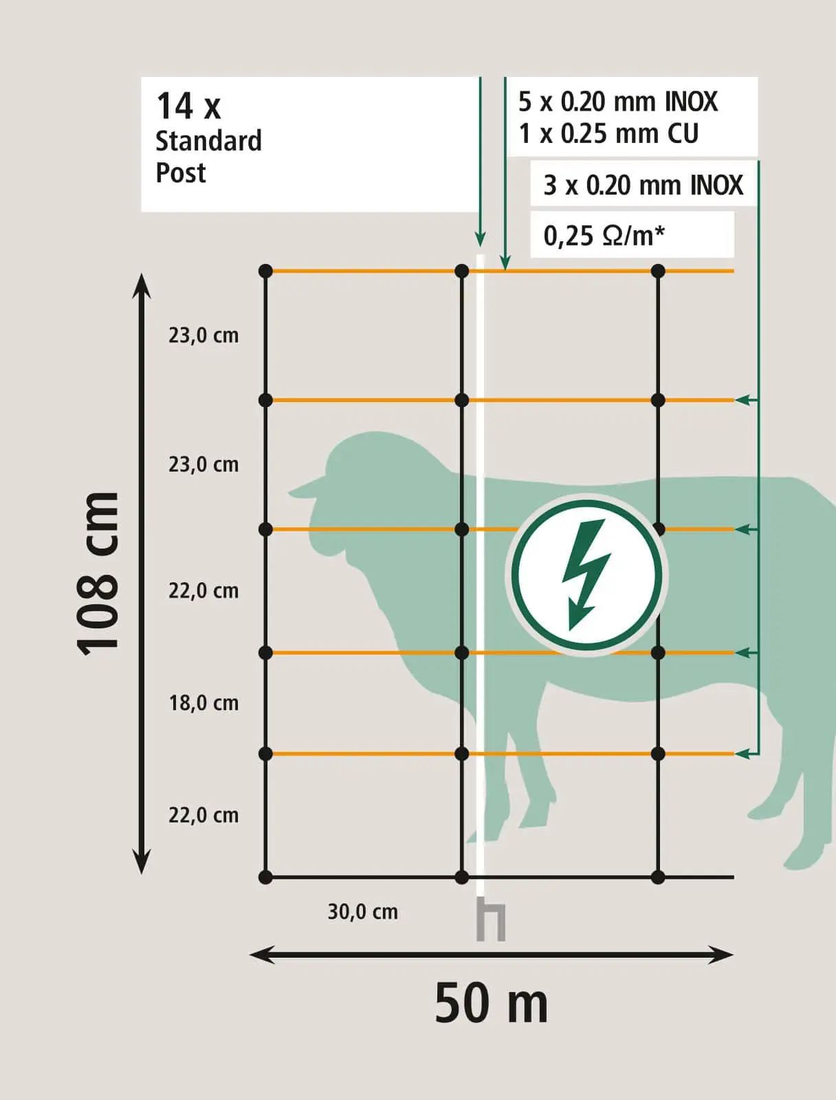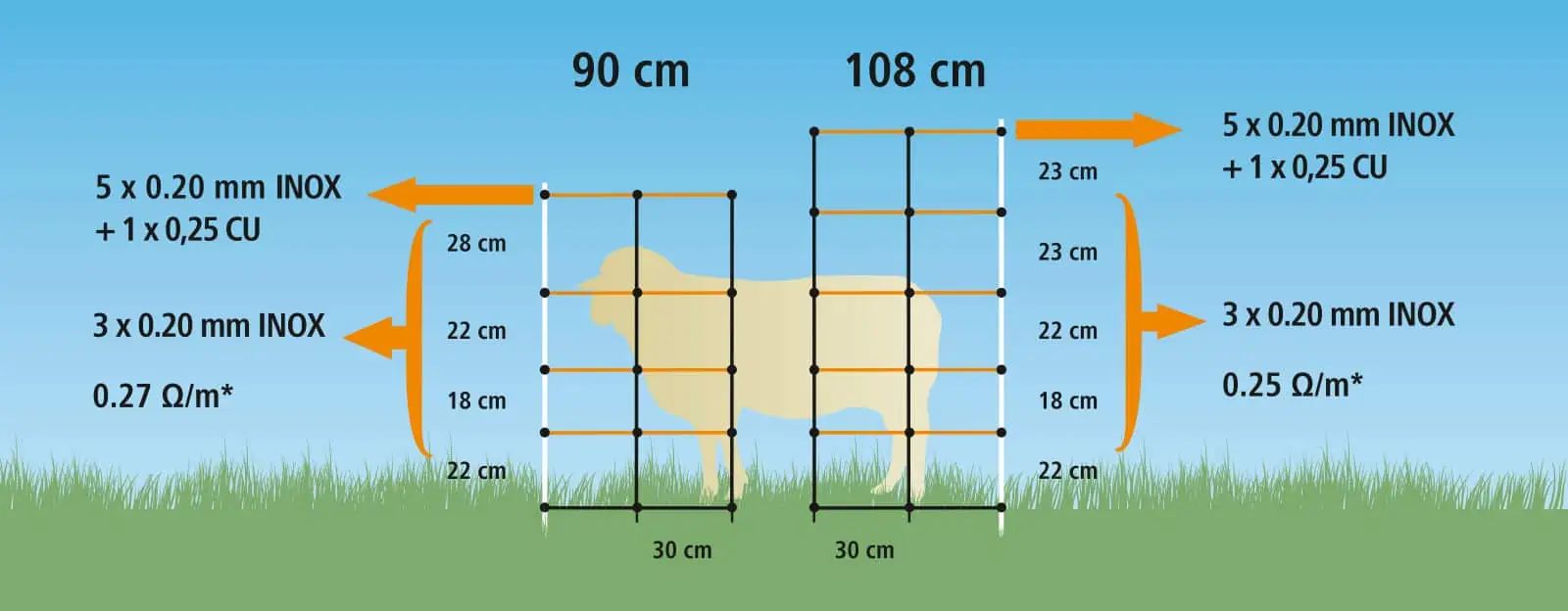 - Magassága 108 cm (6 vízszintes szál), dupla hegy kapható