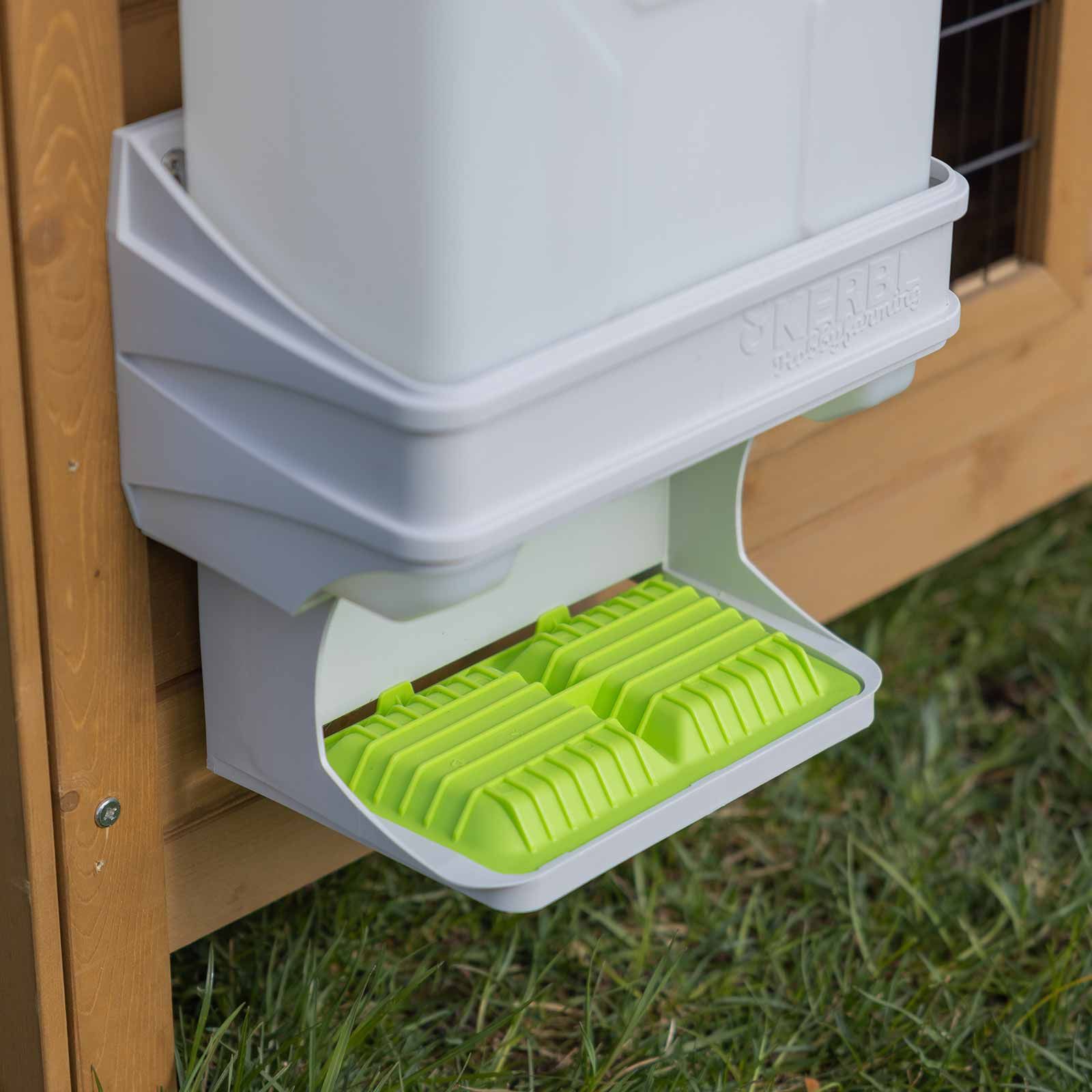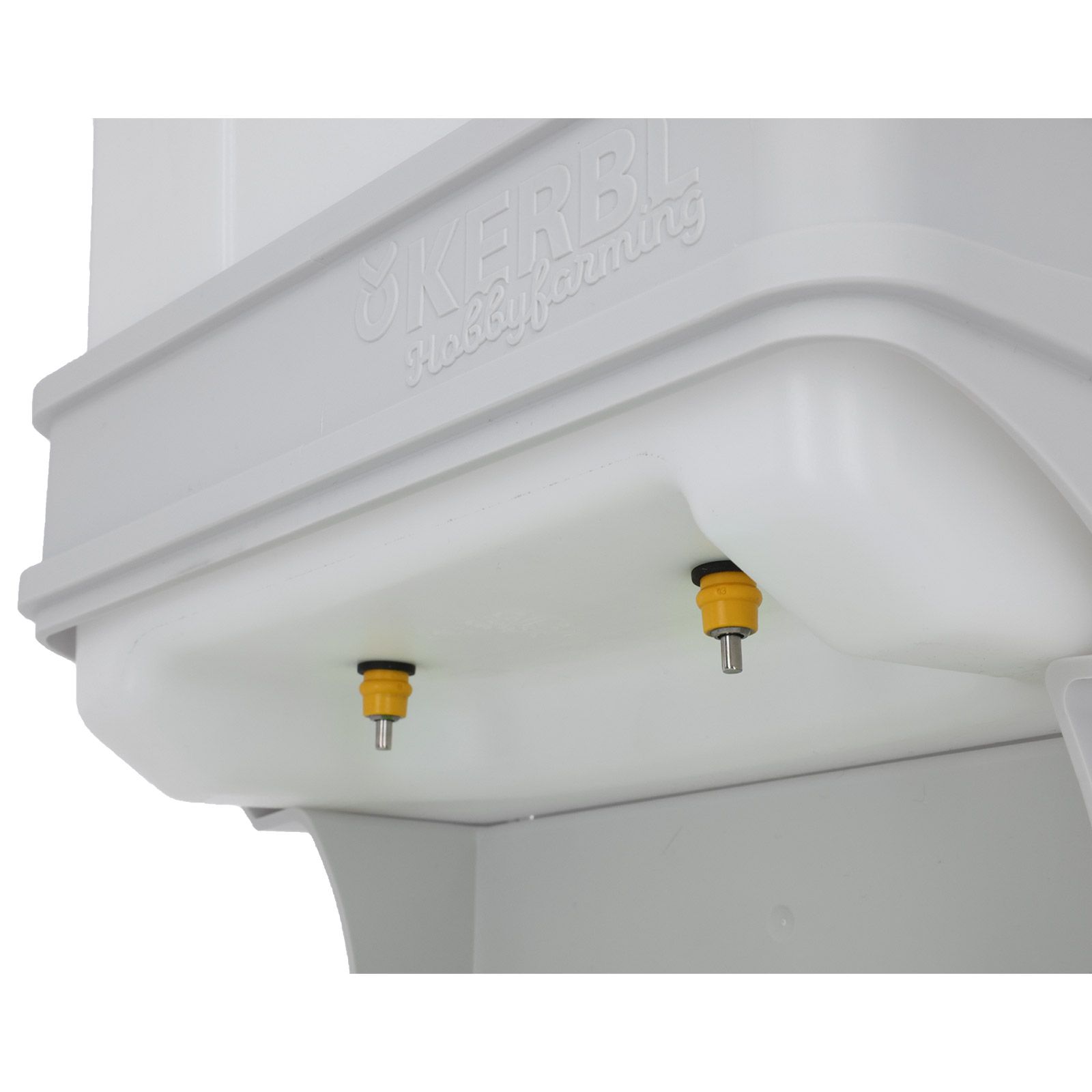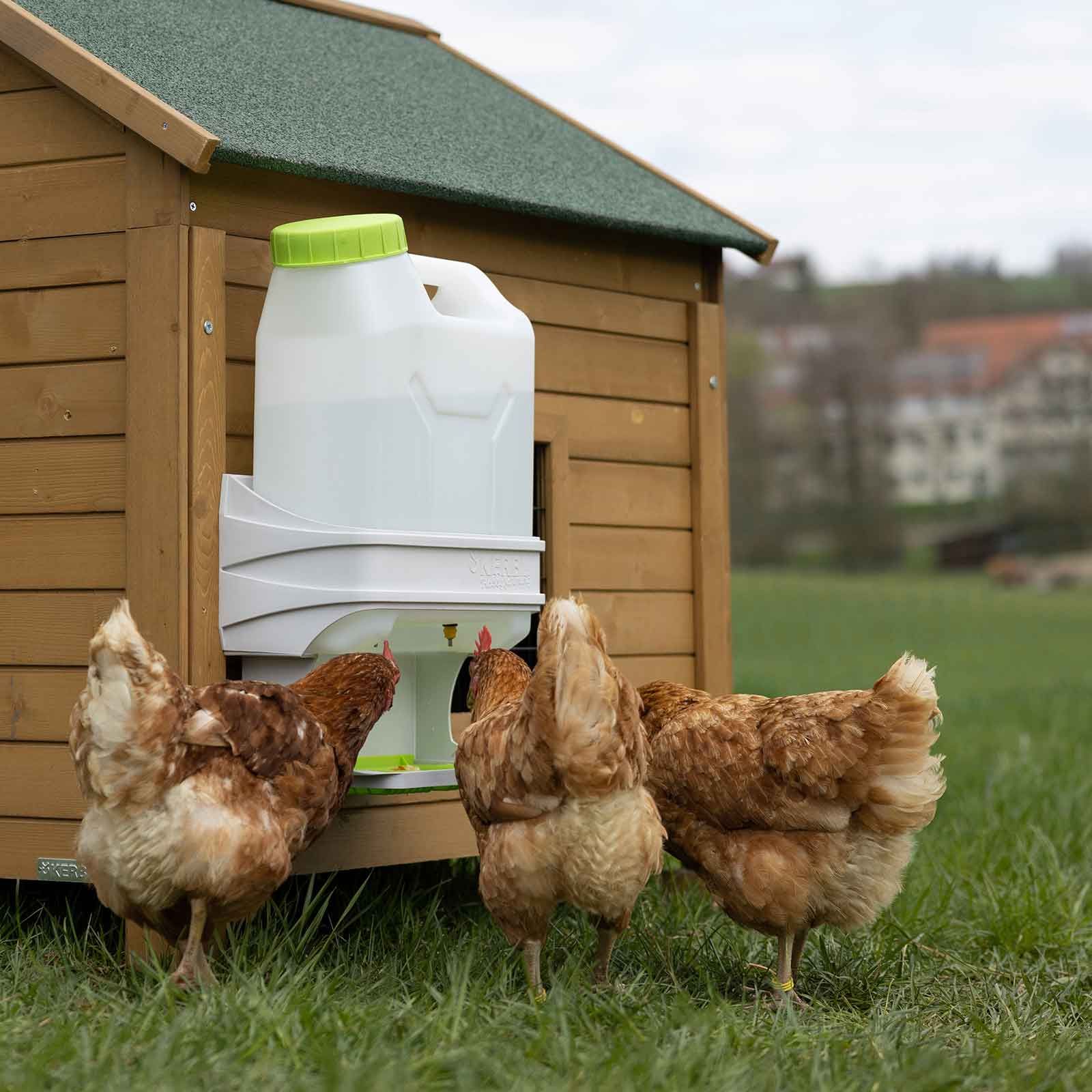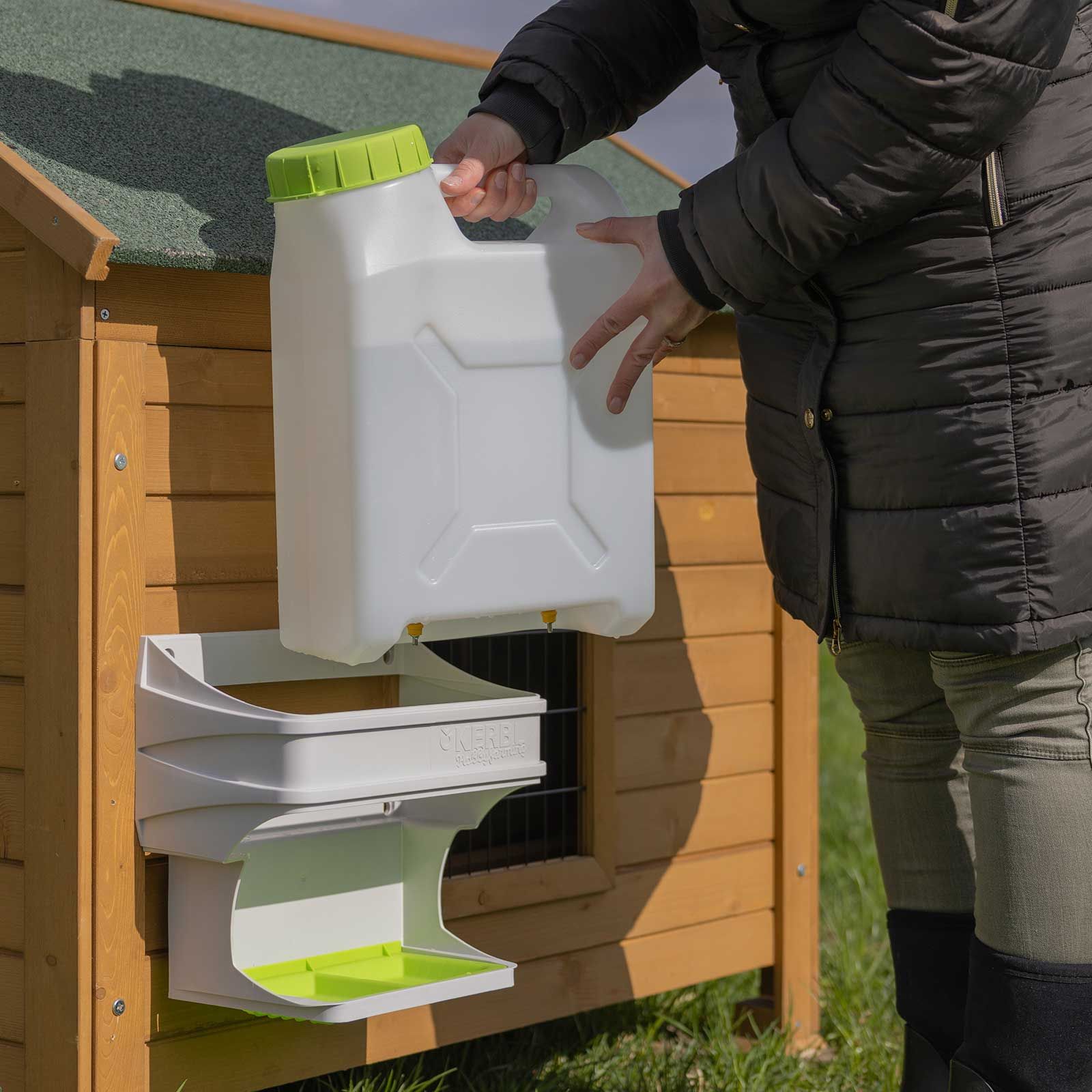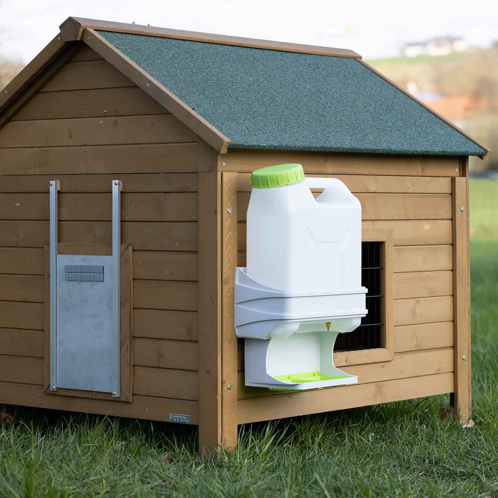 A dugaszolható, menet nélküli és tömített fedél megakadályozza az atkák megtelepedését, a fali tartó pedig helytakarékos és biztonságos telepítést tesz lehetővé. A csepegtető tálca felfogja a felesleges vizet, és akár lépcsőként is elfordítható a csirkék számára.