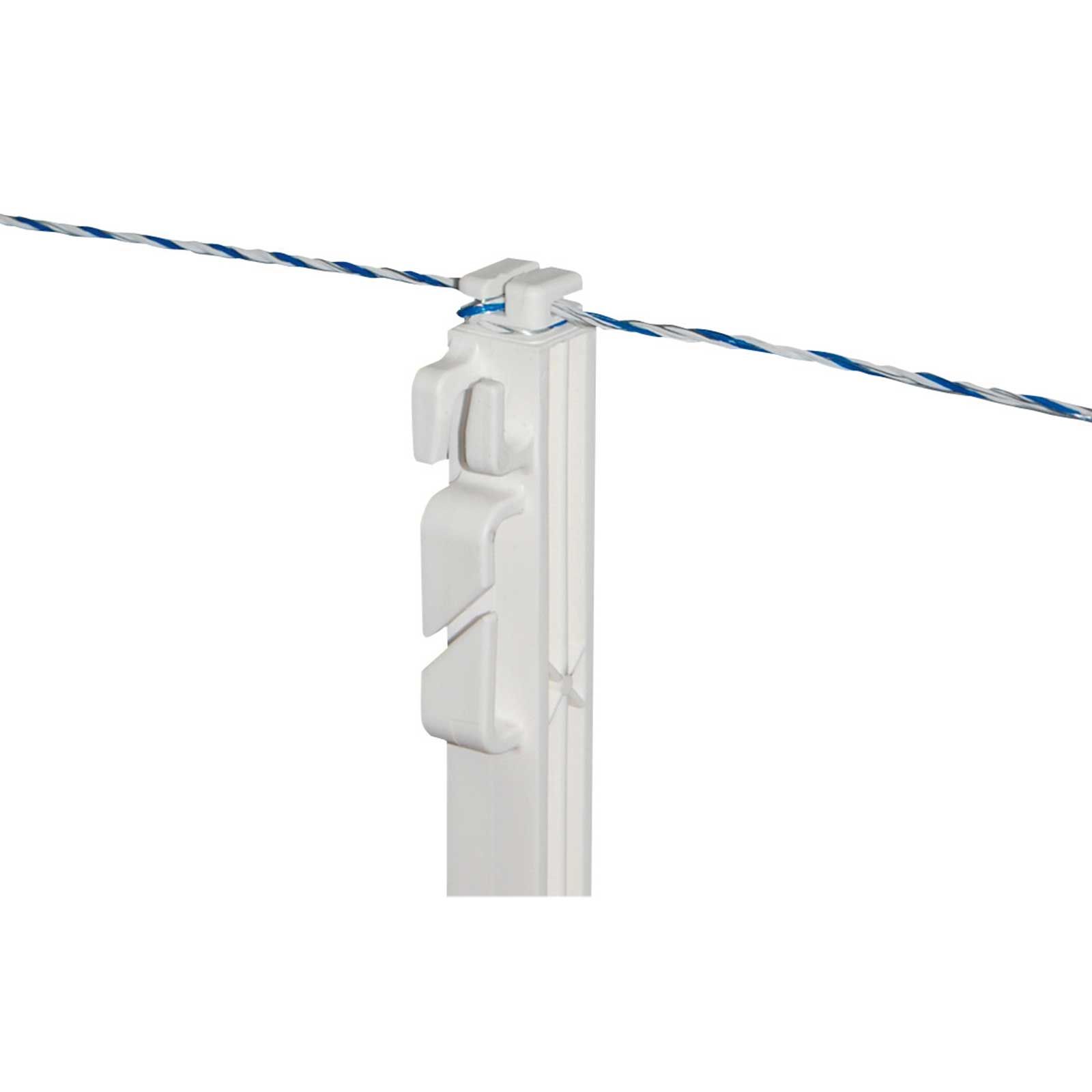 A műanyag villanypásztor karó különböző fűzőlyukakkal rendelkezik, amelyek megkönnyítik és sokoldalúvá teszik a használatát. A kerítésoszlop fején található egyik lyuk a sodrony vagy a drót, míg a másik két lyuk a kötél számára alkalmas. Ezenkívül összesen öt lyuk van a 2 cm széles szalagok számára, és további két lyuk a 4 cm széles szalagok számára. Ez lehetővé teszi a villanypásztor karó követelményeihez való egyéni alkalmazkodást.