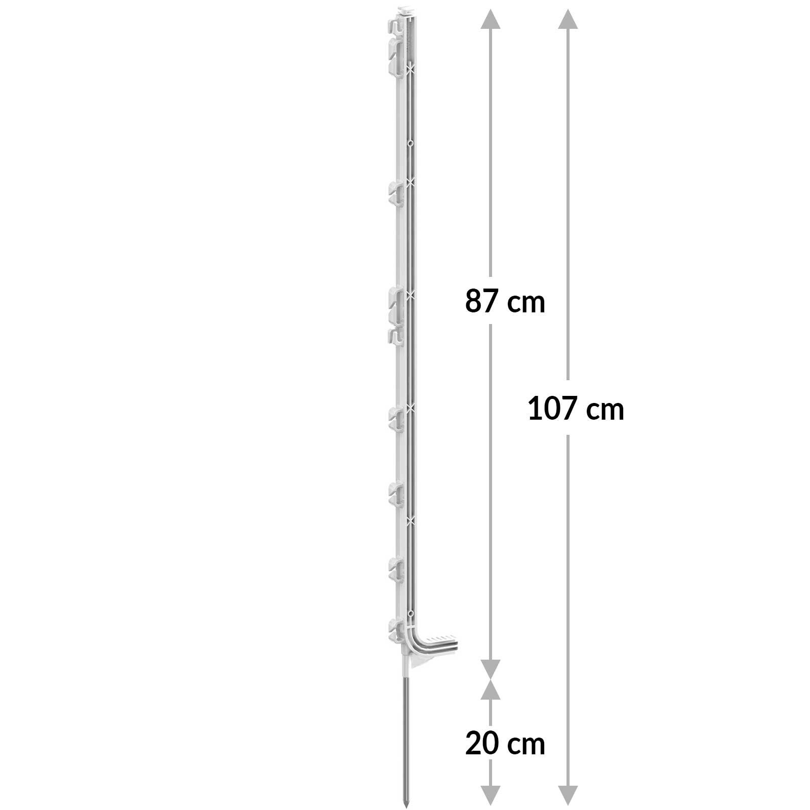 A villanypásztor karó 20 cm hosszú, megerősített földszöggel van ellátva, amely biztosítja a biztonságos és stabil rögzítést a talajban. A műanyag karó teljes hossza 107 cm, a föld feletti hossza 87 cm. A szinte törhetetlen egy taposó megkönnyíti a műanyag villanypásztor karó behelyezését, különösen rossz talajviszonyok között.