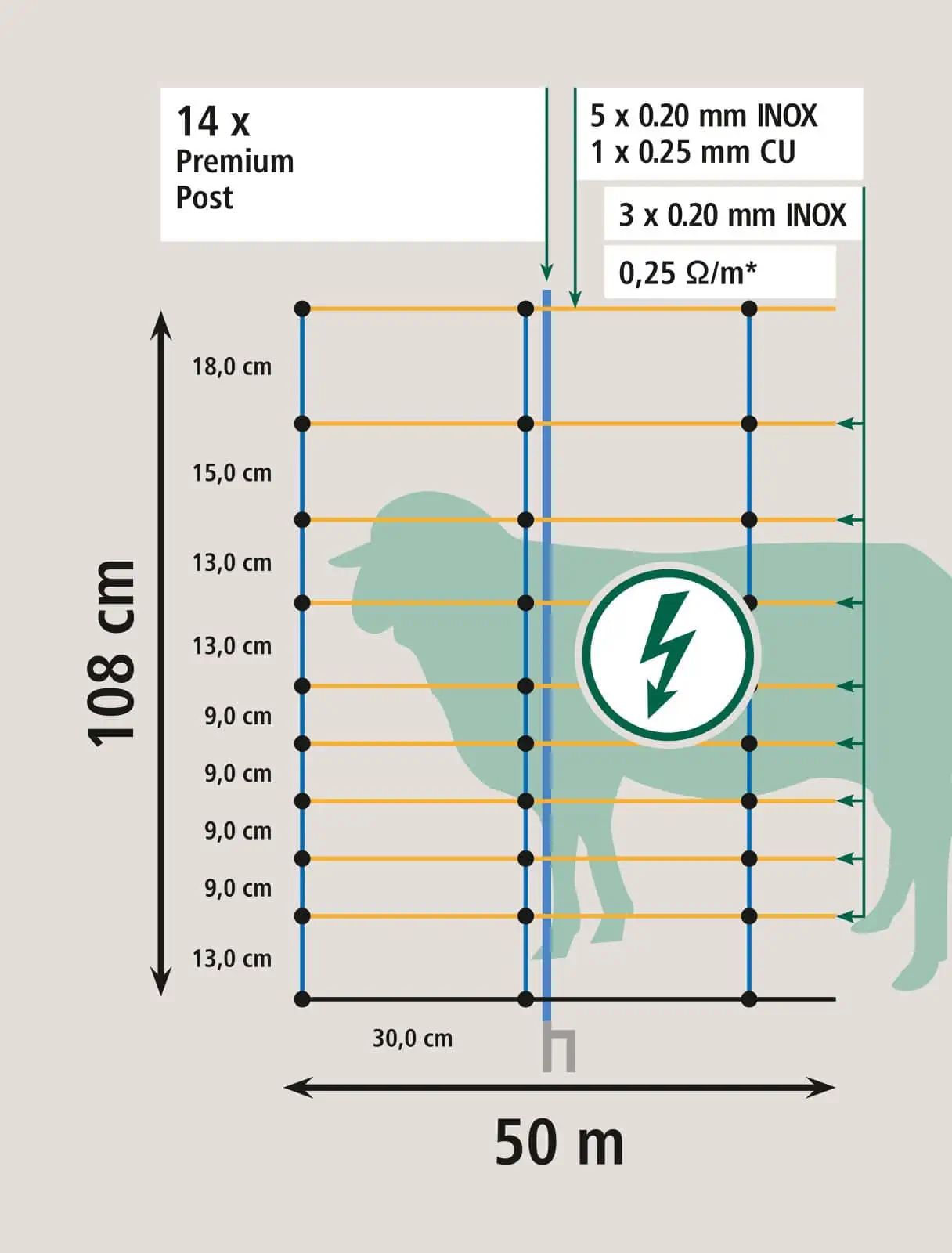 - Magasság: 90 cm (9 vízszintes szál) vagy 108 cm (10 vízszintes szál)