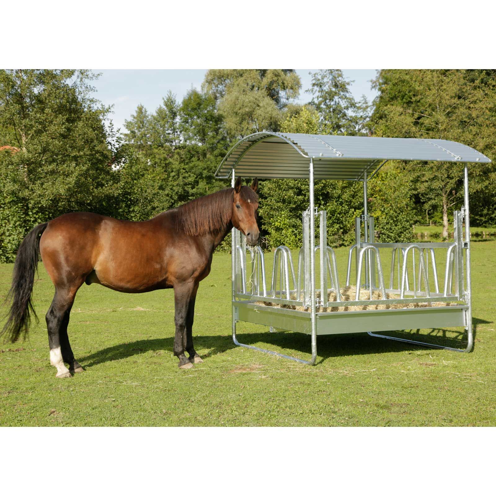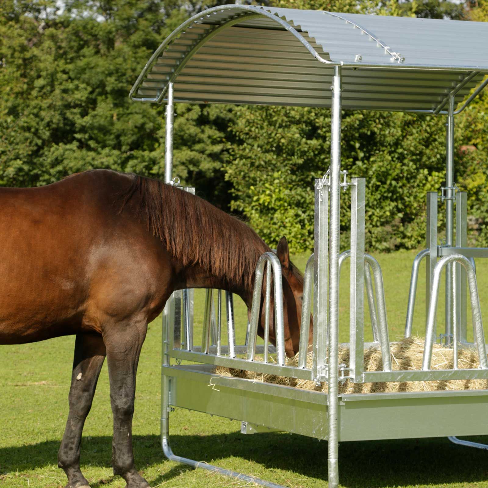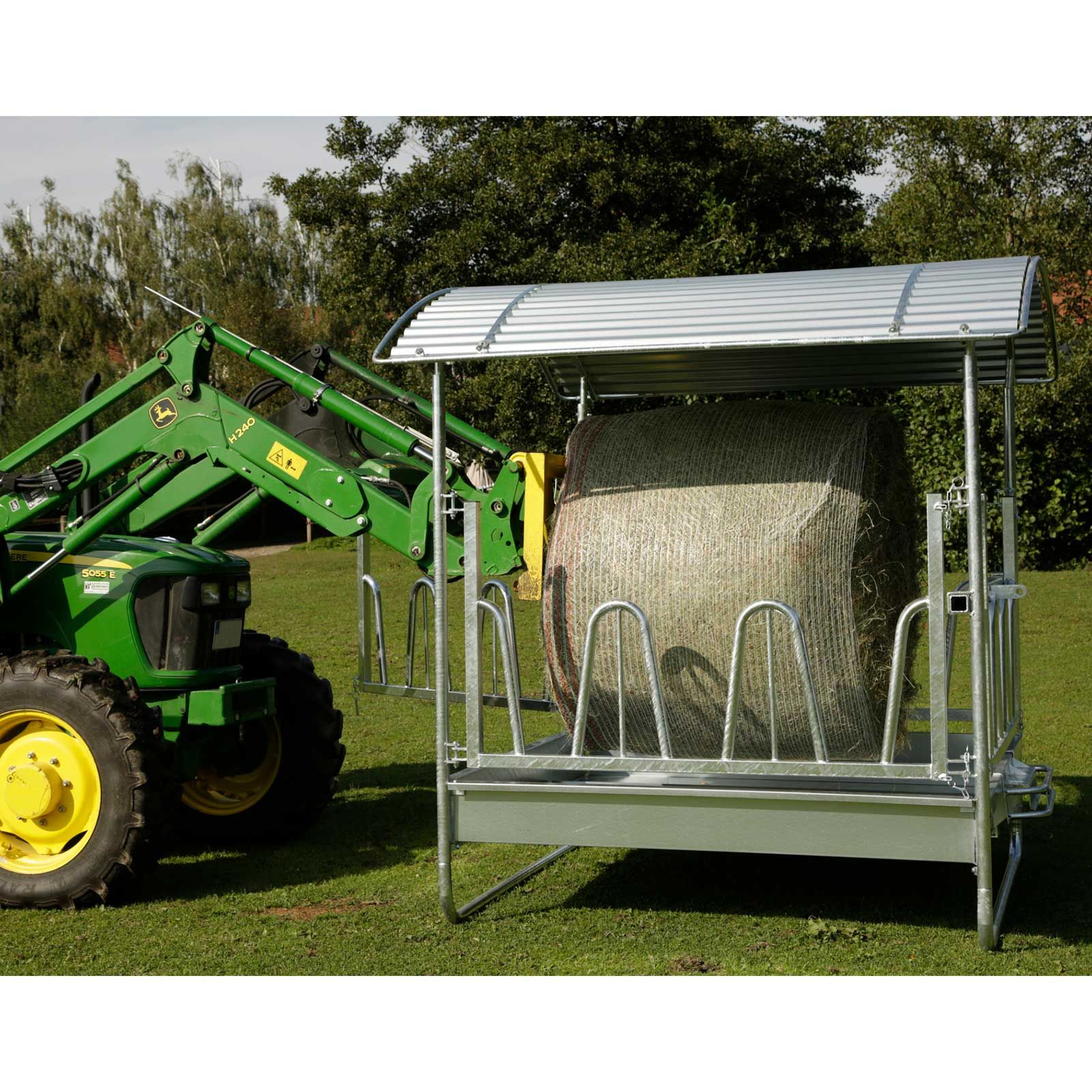 A szénatartó állvány 12 etetési helyet kínál lovak és szarvasmarhák számára, és alkalmas téglalap alakú és kerek bálák tárolására 1,8 m hosszúságig vagy átmérőig. A szénatartó rácsot négyszögletes csőből készült alagerendával is felszerelték, és tűzihorganyzott. Mivel 2 oldala nyitható, a szénatartó könnyen feltölthető téglalap alakú és kerek bálákkal. A tetőnek köszönhetően a gereblyében lévő takarmány nem nedvesedik át teljesen, így hosszabb ideig jó minőségű takarmányt biztosít. A takarmányveszteség a gyűjtőtálcának köszönhetően alacsony, és takarmányhálóval optimalizálható. A lovak és a szarvasmarhák szénatartó állványának helyzete a traktorral könnyen változtatható a stabil hárompontos vonószerkezetnek köszönhetően. A mellékelt védőrúd és a körkörös tetőszegély-védelem megvédi az állatokat a sérülésektől .