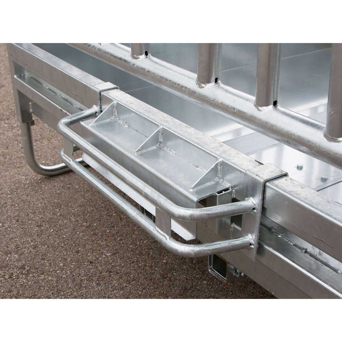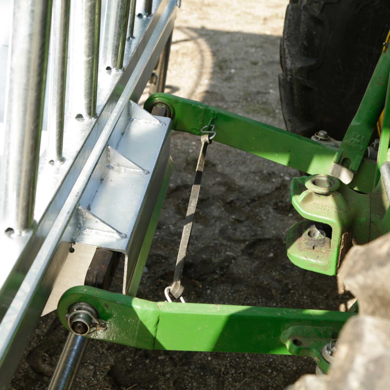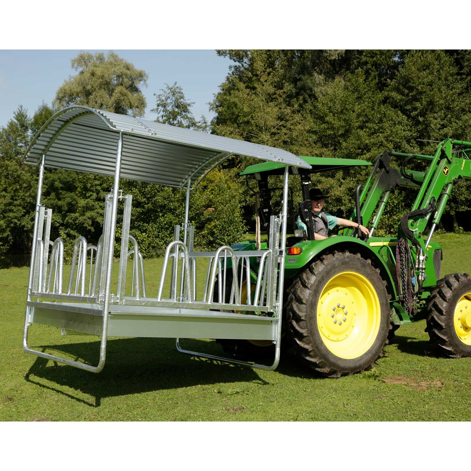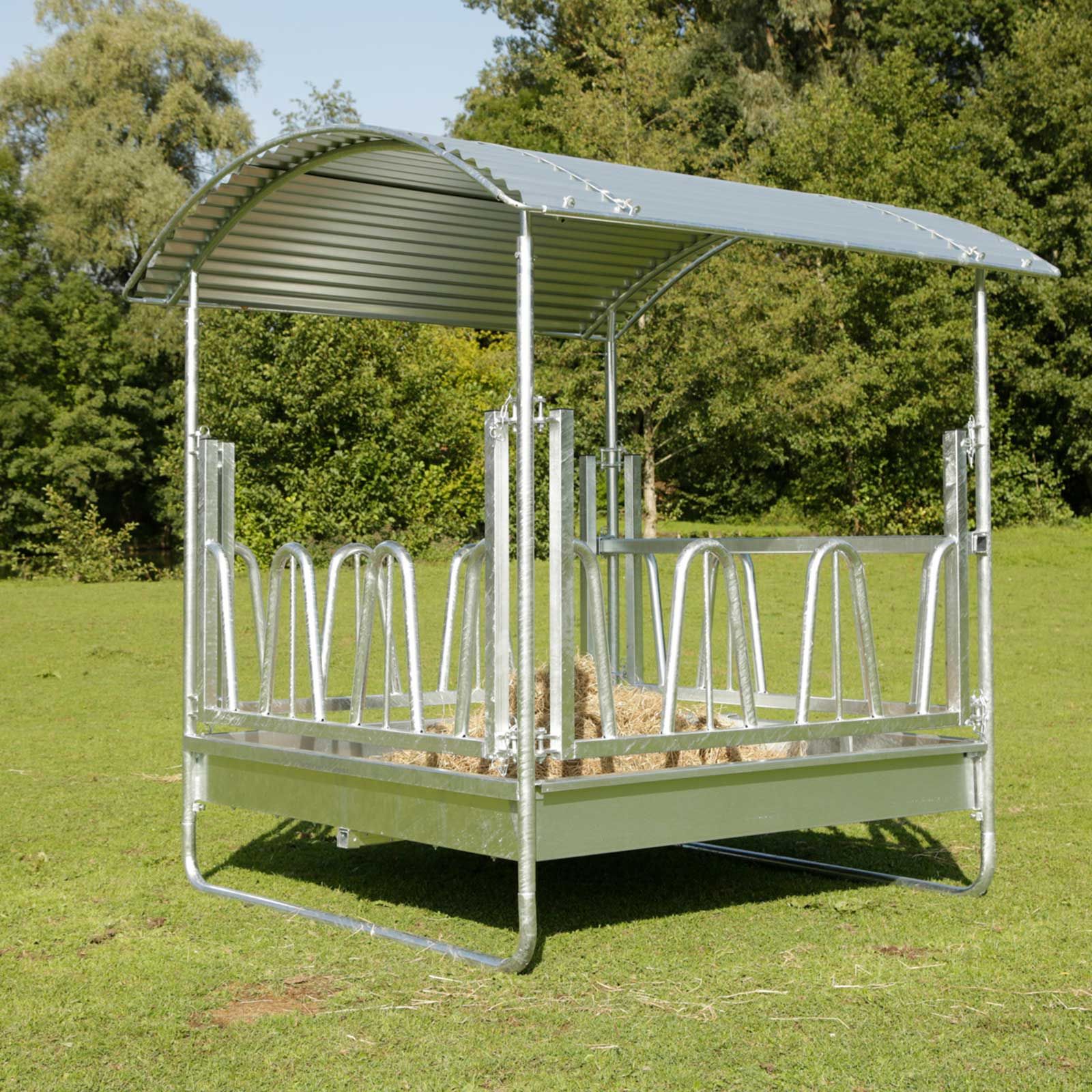 A szénatartó állvány 12 etetési helyet kínál lovak és szarvasmarhák számára, és alkalmas téglalap alakú és kerek bálák tárolására 1,8 m hosszúságig vagy átmérőig. A szénatartó rácsot négyszögletes csőből készült alagerendával is felszerelték, és tűzihorganyzott. Mivel 2 oldala nyitható, a szénatartó könnyen feltölthető téglalap alakú és kerek bálákkal. A tetőnek köszönhetően a gereblyében lévő takarmány nem nedvesedik át teljesen, így hosszabb ideig jó minőségű takarmányt biztosít. A takarmányveszteség a gyűjtőtálcának köszönhetően alacsony, és takarmányhálóval optimalizálható. A lovak és a szarvasmarhák szénatartó állványának helyzete a traktorral könnyen változtatható a stabil hárompontos vonószerkezetnek köszönhetően. A mellékelt védőrúd és a körkörös tetőszegély-védelem megvédi az állatokat a sérülésektől .