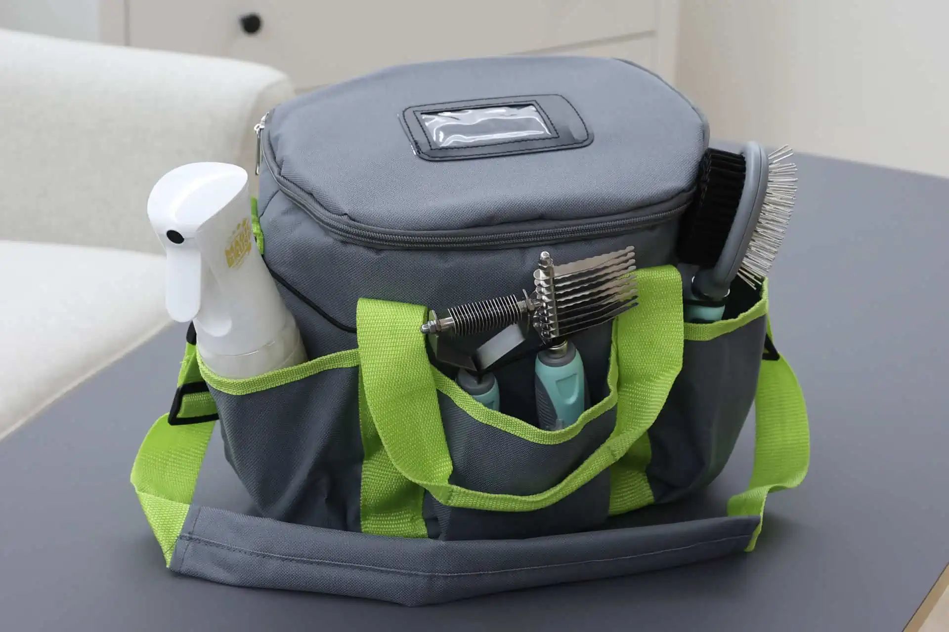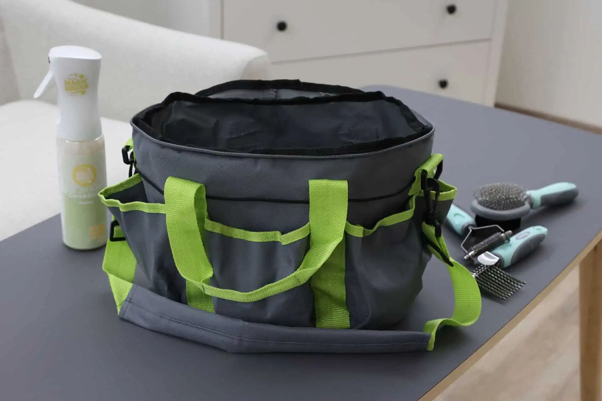 A 27x22x22 tárolózseb, az antracit/pistachie, különösen alkalmas azok számára, akik gondozási termékeiket vagy játékokat akarják megfelelően és biztonságosan megőrizni.