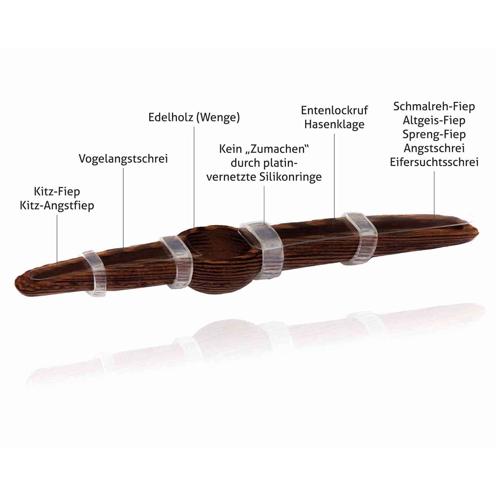 A Weisskirchen Edelholzmundbatter egy magas színvonalú reteszelő műszer, amely finom keményfaból (Wenge) készül, folyékony méhviaszokkal finomítva. A zárlista számos lehetőséget kínál a laza vadászatra. Ezzel a sokoldalú laza esetén utánozhatja a női roe szarvas hangjait, és így a levélidőben minden bizonnyal vonzza a kecskét