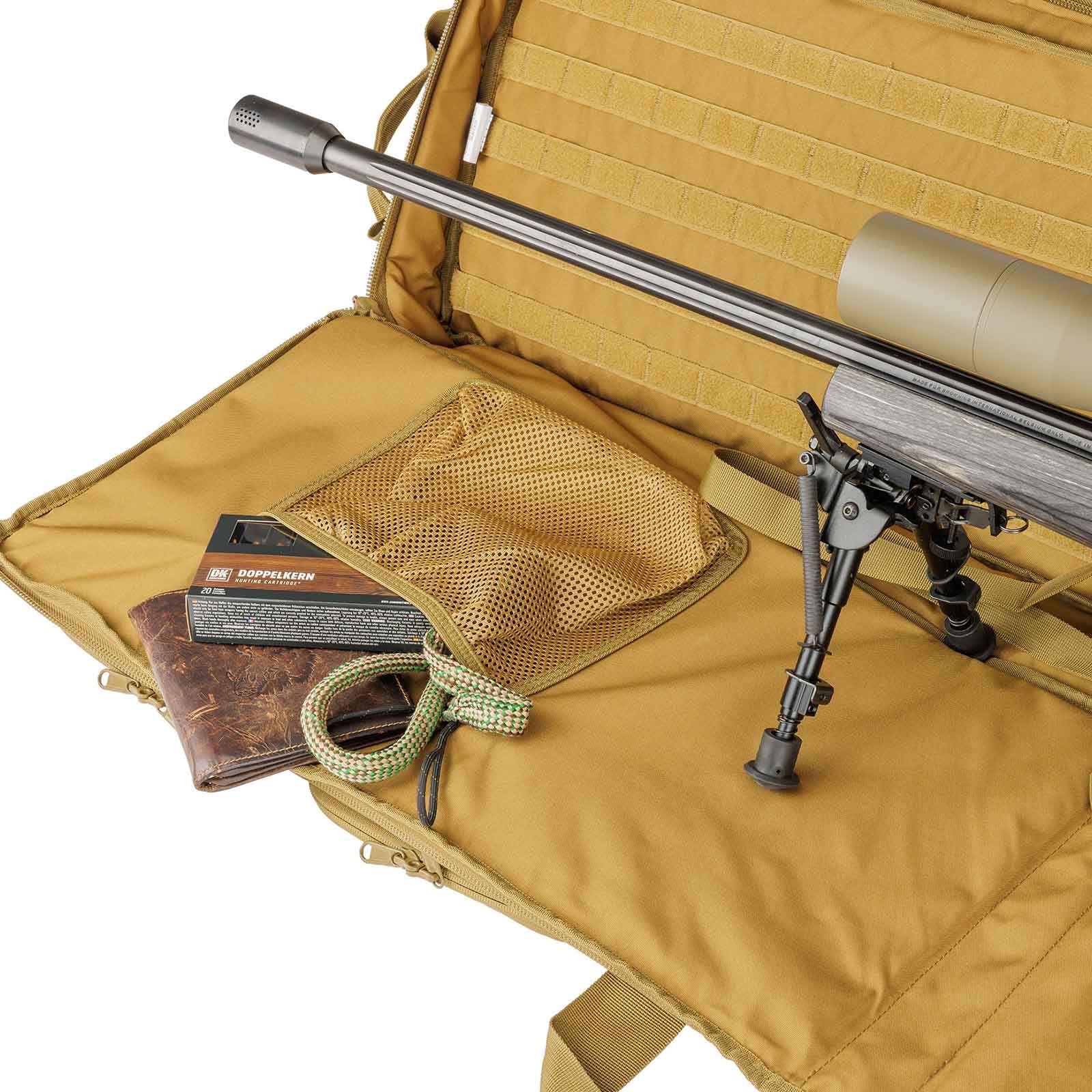 A pisztolytáska 1000D nylon -ból készül, amely tartósságáról és ellenállásáról ismert. Az YKK cipzárak biztosítják a fegyver biztonságos tárolását és az egyszerű akadálymentességet. Legfeljebb 130 cm -es hosszúságú fegyvereket képes elnyelni