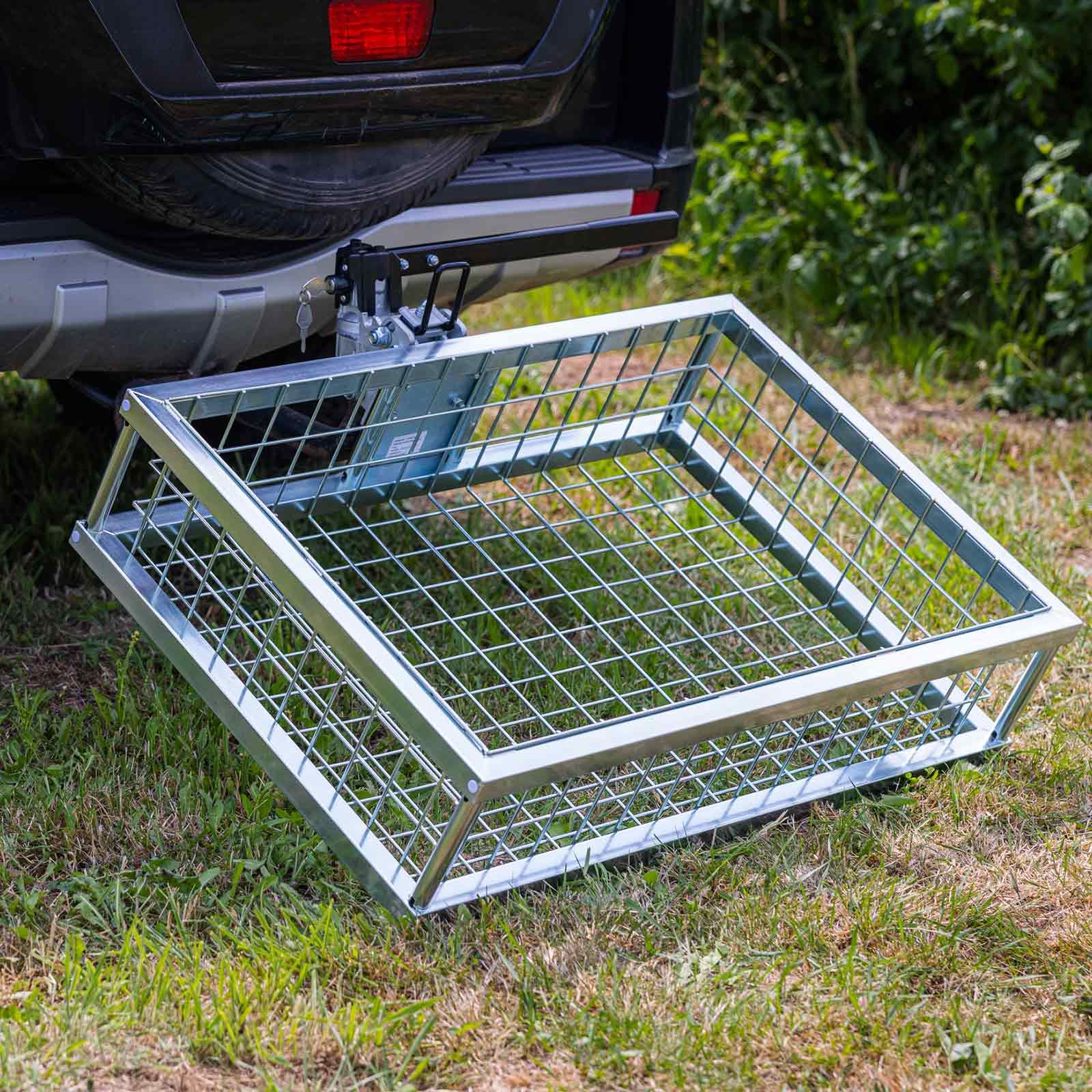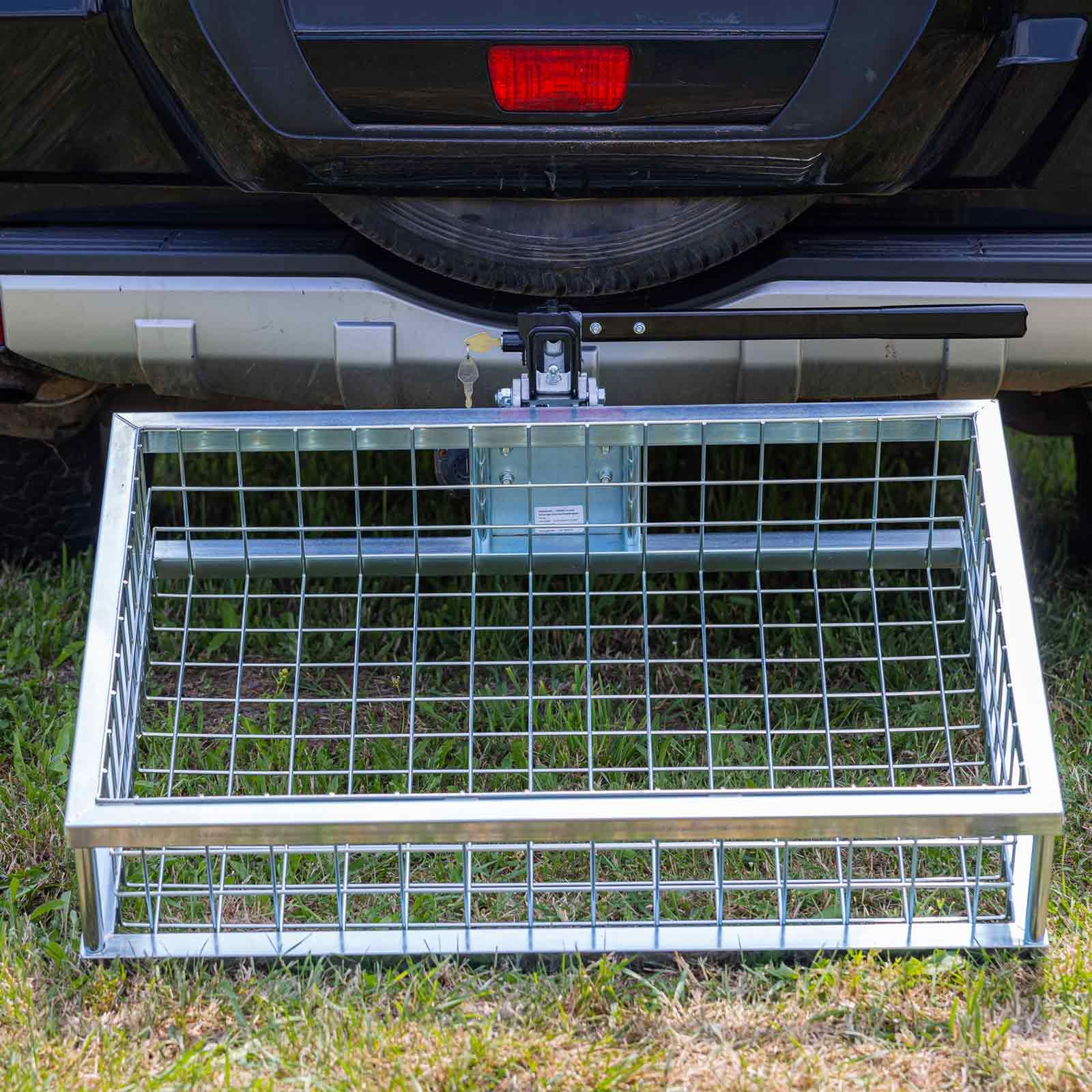 A hátsó hordozó horganyzott, tengelykapcsoló -összecsukható 89x58,5x20 cm nélkülözhetetlen eszköz mindenkinek, akinek gyakorlati és megbízható szállítási megoldása van szüksége. Akár megölt játék, csali vagy más tárgyak, ez a hátsó hordozó elegendő helyet kínál, és könnyű összeszerelhető a pótkocsi kapcsolóján.
