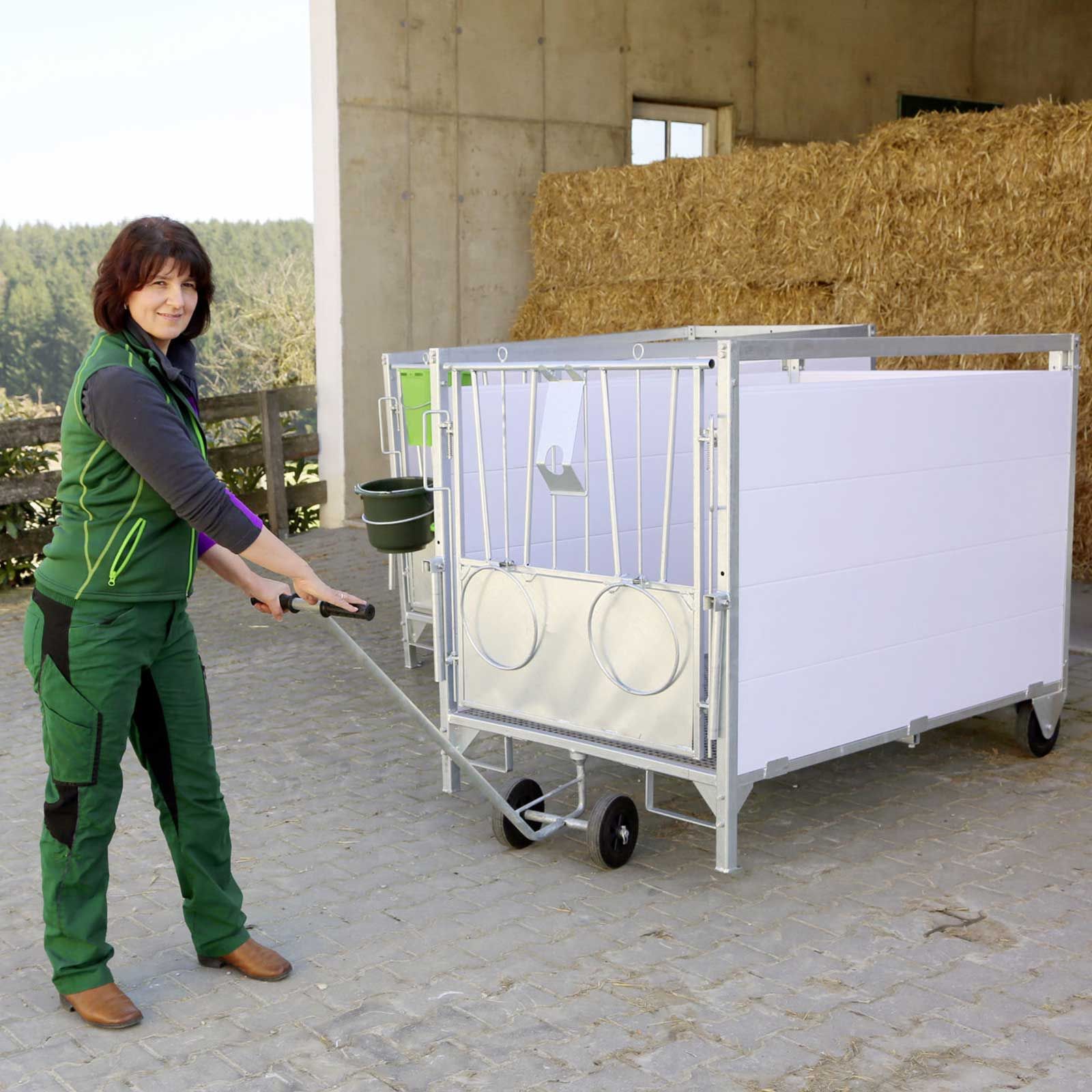 A mobil eszköz a Kerbl borjúboxhoz alkalmas. A kerekek segítségével a borjúdoboz mobil, és még könnyebben és gyorsabban mozgatható.
