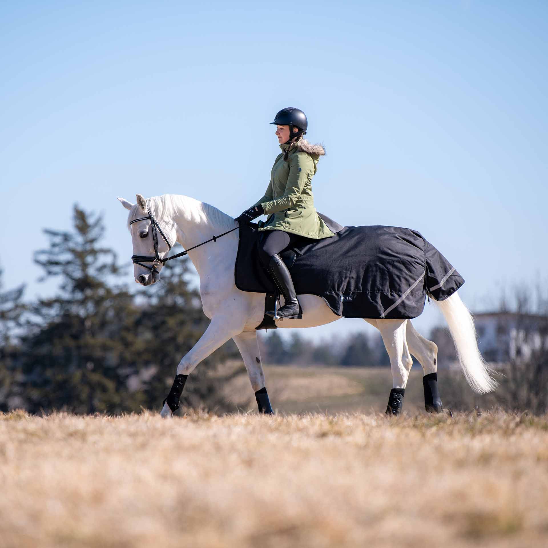 A 100 g -os többszörös töltés biztosítja az enyhe hőszigetelést. A sima, szőrme barátságos szaténezés biztosítja, hogy a ló mozgását ne érintse, és ugyanakkor magas szintű kényelmet kínál. A mennyezet lehetővé teszi a zavartalan segédanyagot az oldalsó lovaglás során. A nyeregszakaszot a nyereg levél alatti útmutatóhoz tervezték.