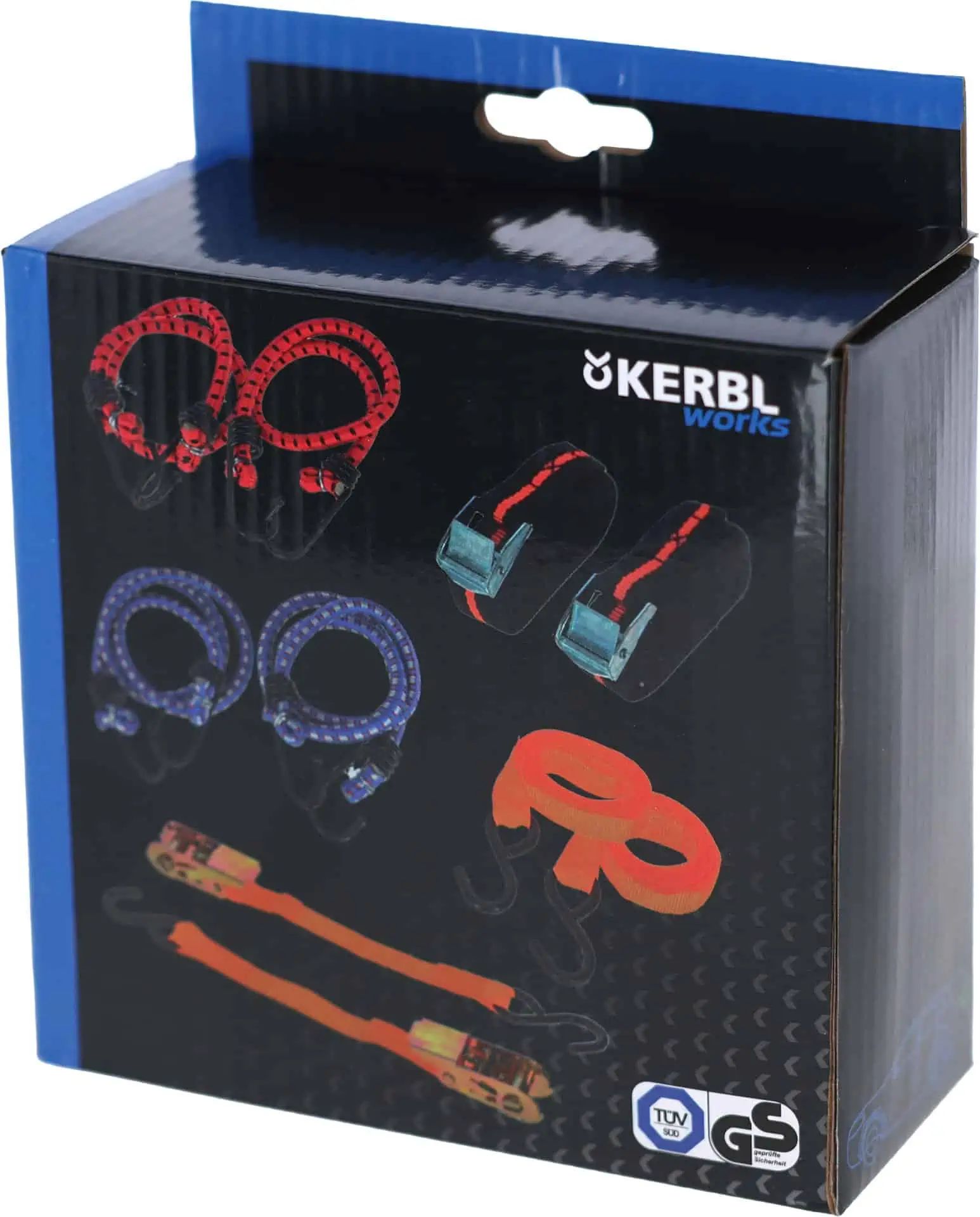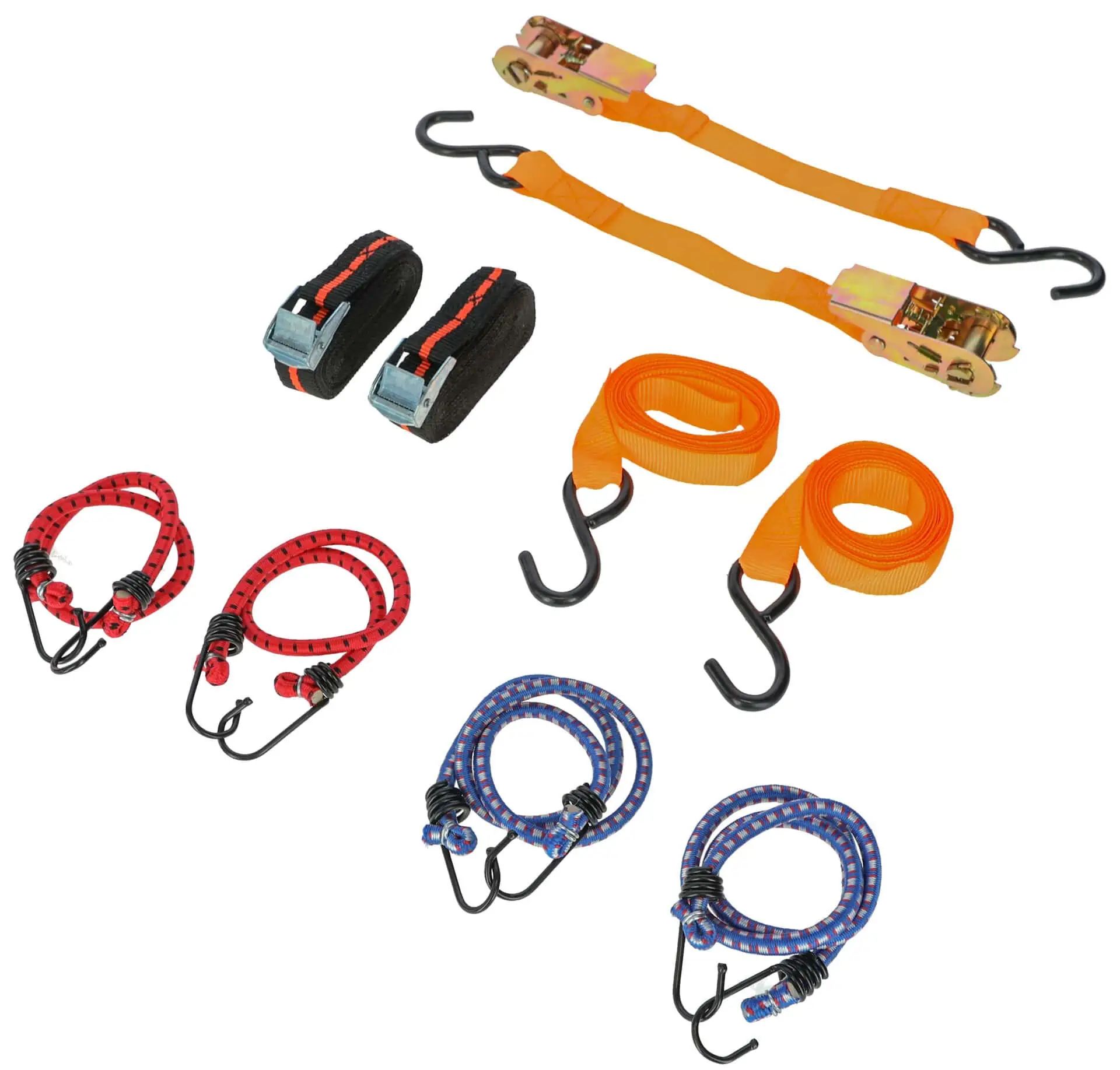 A készlet különféle típusú kötőszíjakat és expander -t tartalmaz: 4 Expander és 4 kötőszíj különböző verziókban, szorító zárral, racsnis és s horgokkal. Ez a széles választék lehetővé teszi a professzionális terhelések biztosítását, függetlenül az alaktól és a méretétől.