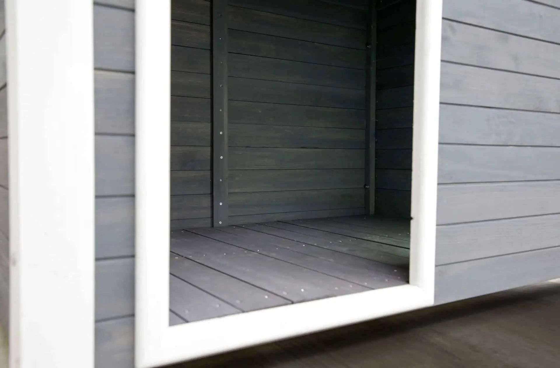 A kutyaházat kívülről fapékkel festették, ami vonzó megjelenést kölcsönöz, és ugyanakkor megvédi a fát az időjárási hatásoktól. Ezenkívül a kunyhó műanyag lábakkal van felszerelve, amelyek biztosítják a stabilitást és a jó légáramlást a kunyhó alatt.