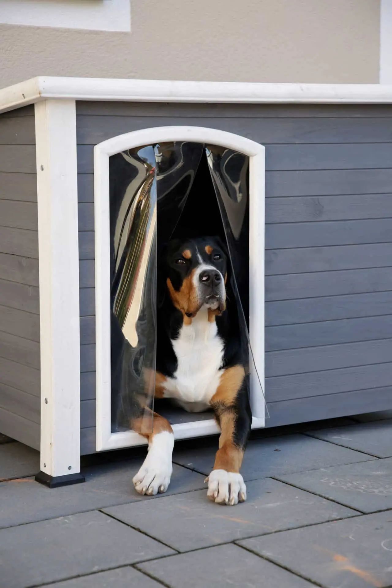 Az átlátszó lécekből készült függöny további védelmet nyújt a szél és az időjárás ellen, anélkül, hogy akadályozná a kutya nézetét. A kutyaházat bontották le, de a zárt telepítési utasításoknak köszönhetően könnyen felszerelhetők.