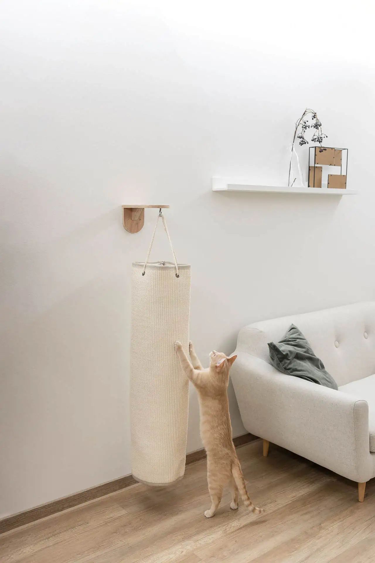 A hegymászó táska egy magas színvonalú szizális szőnyegből áll, amely kiváló felületet kínál a karcoláshoz, és tele van egy párnázott párnával, hogy megzavarja háziállatát, hogy játsszon és mászjon. A fal rögzítéséhez szükséges szög és összeszerelő anyaggal szállítható, és horoggal könnyen fel -le lógható.