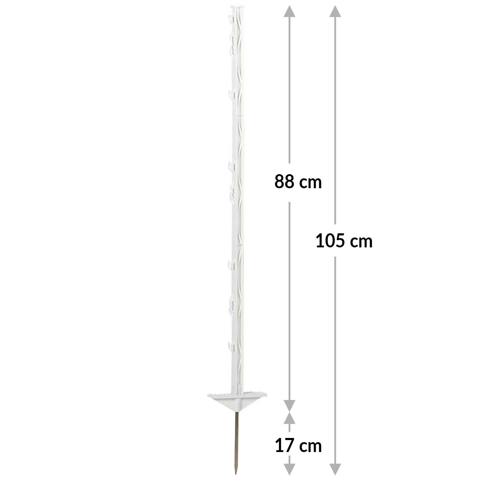 A műanyag villanypásztor karó 5 fűzőlyukkal van ellátva a kötelek számára, 2 szemmel a 2 cm széles szalagok számára és 1 szemmel a 4 cm széles szalagok számára. Ezek a fűzőlyukak különböző lehetőségeket kínálnak a villanypásztor vezetők rögzítésére. A műanyag karó teljes hossza 105 cm, 88 cm-rel a talaj felett. Ez a méret lehetővé teszi, hogy a műanyag karó számos alkalmazásban használható legyen.