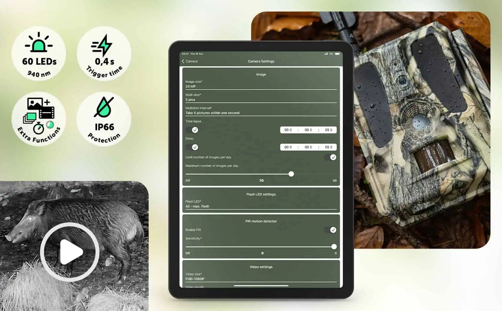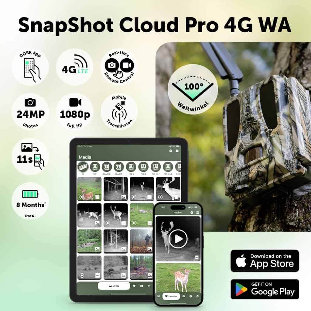 The SnapShot Cloud Pro 4G WA Surveillance Camera is more than just a surveillance device. It is your window to the world, no matter where you are. As a technical solution for high-resolution wildlife observation and security surveillance, it combines cutting-edge technologies with intuitive usability. Thanks to the intuitive DÖRR APP for iOS and Android and a user-friendly web application, you always have full control over your surveillance camera. With impressive images of up to 24 MP and razor-sharp Full HD videos, you are always in the loop.