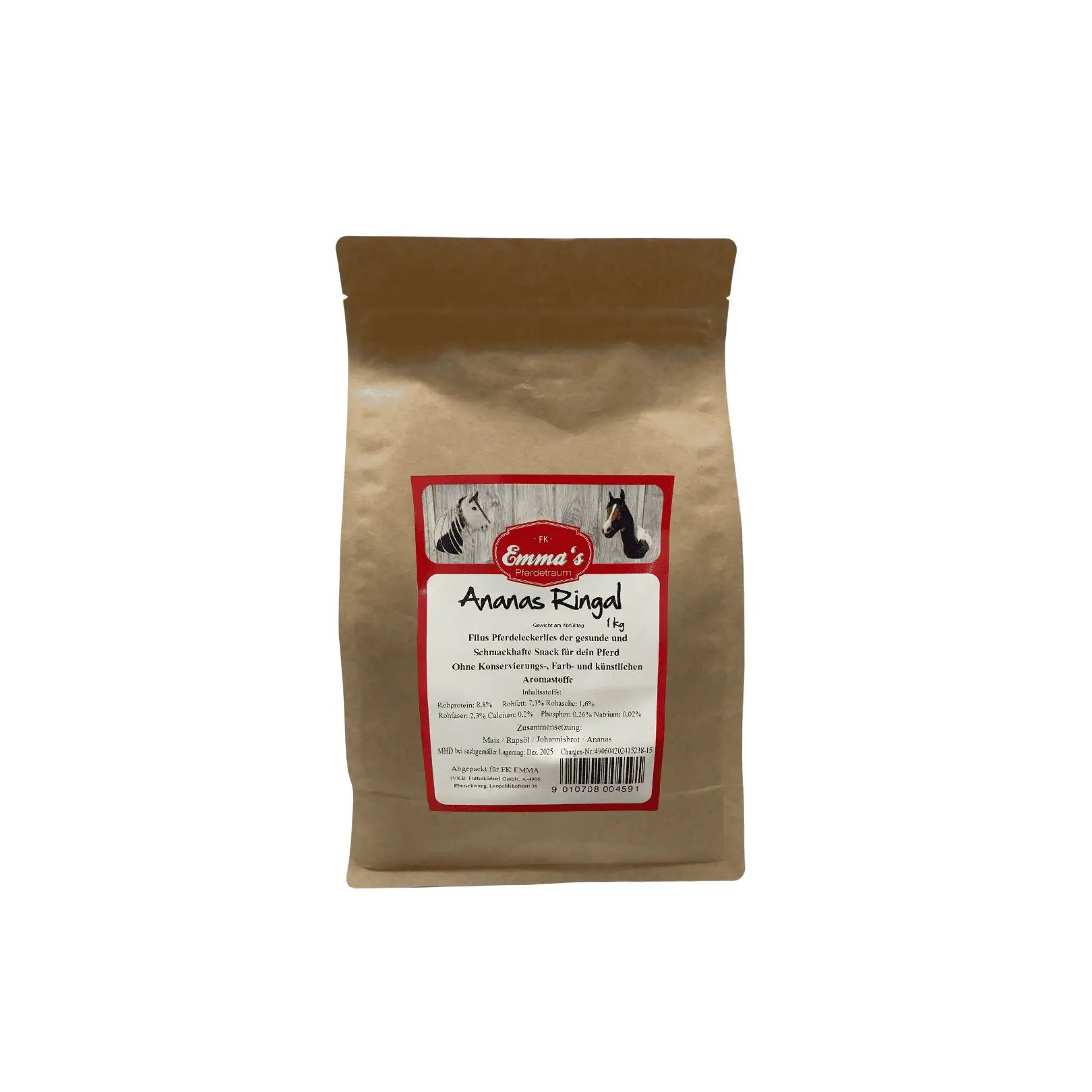 Whether as a reward after training or just as a snack, Emma's Horse Treats Pineapple Ringal are ideal for horse owners who value a chemical-free diet. With a convenient size of 3 x 1 cm, they fit perfectly into any feed pouch and are easy to handle.