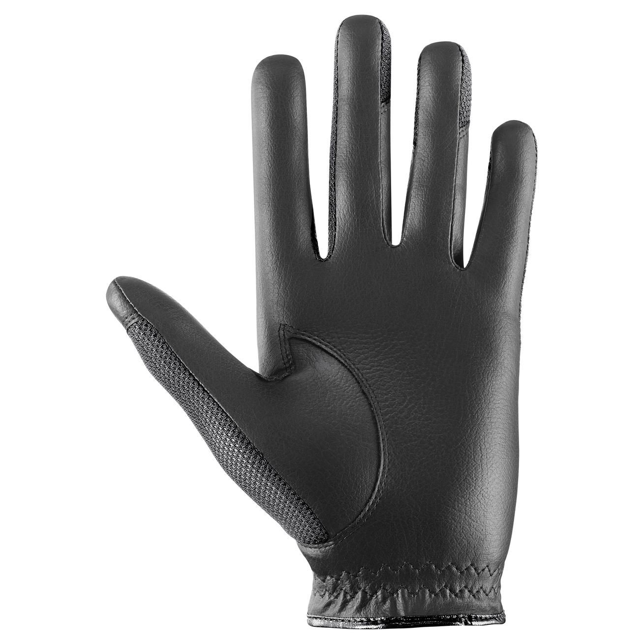 The uvex riding gloves sumair are specially designed for riders who need maximum grip and comfort even under high intensity and adverse conditions in the saddle. The high abrasion resistance of the palm area, made of non-slip and particularly durable PU material, ensures a fine rein feel with optimal grip. The breathable mesh material on the back of the hand and thumb efficiently wicks away moisture and provides optimal ventilation. These gloves combine functionality and style, thanks to high-quality materials like shiny faux leather, PU, and mesh. The black lacquer details and sporty lines make the uvex sumair a fashionable highlight in equestrian sports. With its short cut, this glove is also the ideal companion for stylish performance in the saddle at high temperatures.