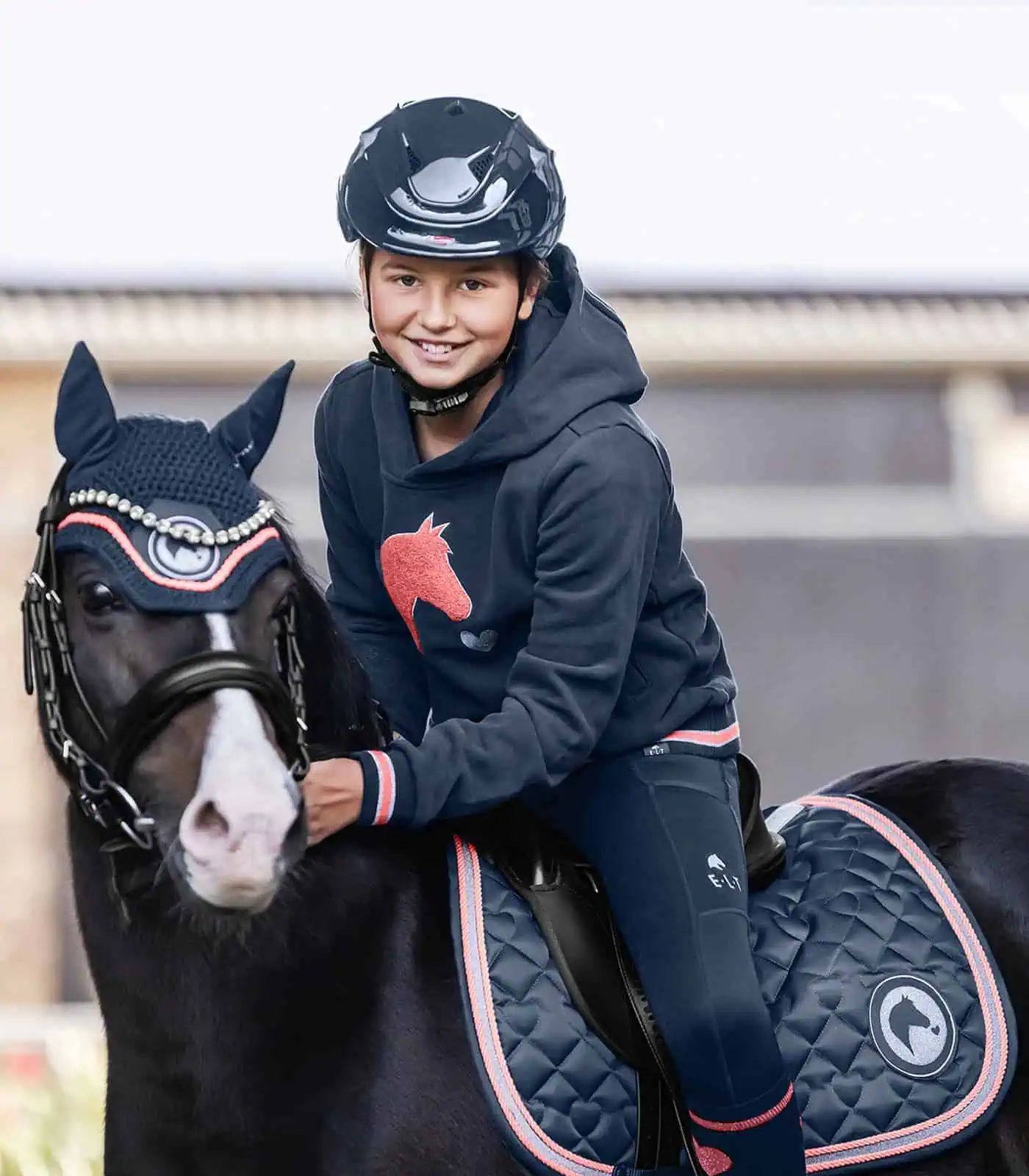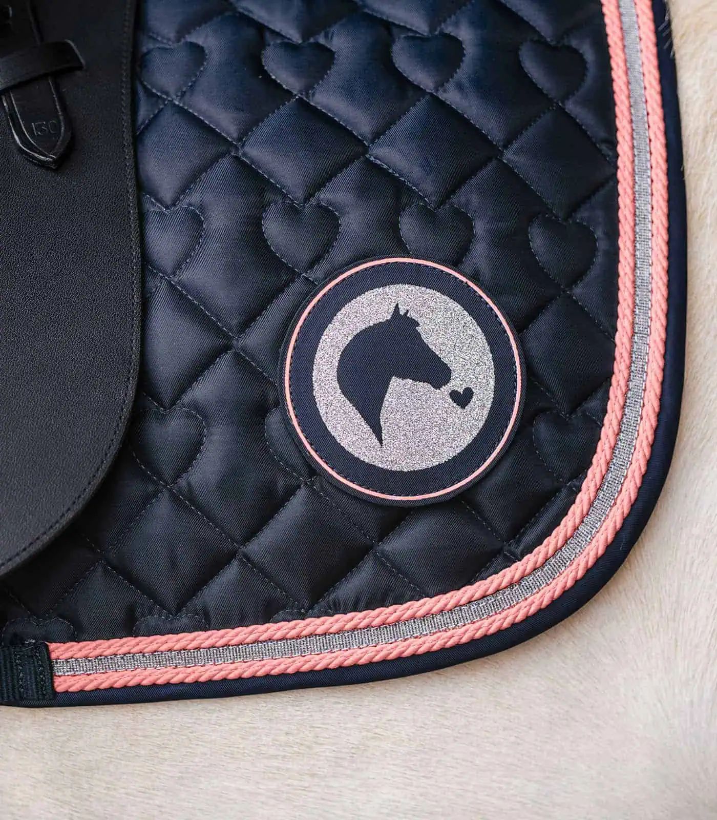 Quality saddle pad with little hearts quilting and silvery glitter cord. A cute glitter kiddies" motif is a finishing touch. 200g/m² padding and 10 mm special foam ensure optimum pressure distribution and shock absorption.