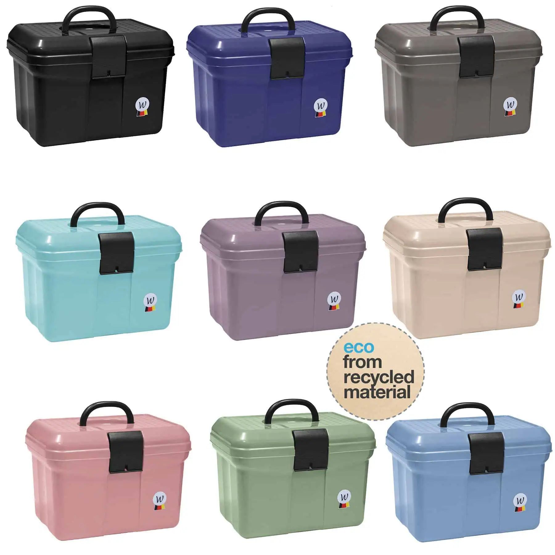 High quality grooming box in recycled plastic. The perfect companion in the stable and at competitions. Retractable handle, closable snap fastening, doubly adjustable partition, removable small parts compartment and its light weight make it stand out!
