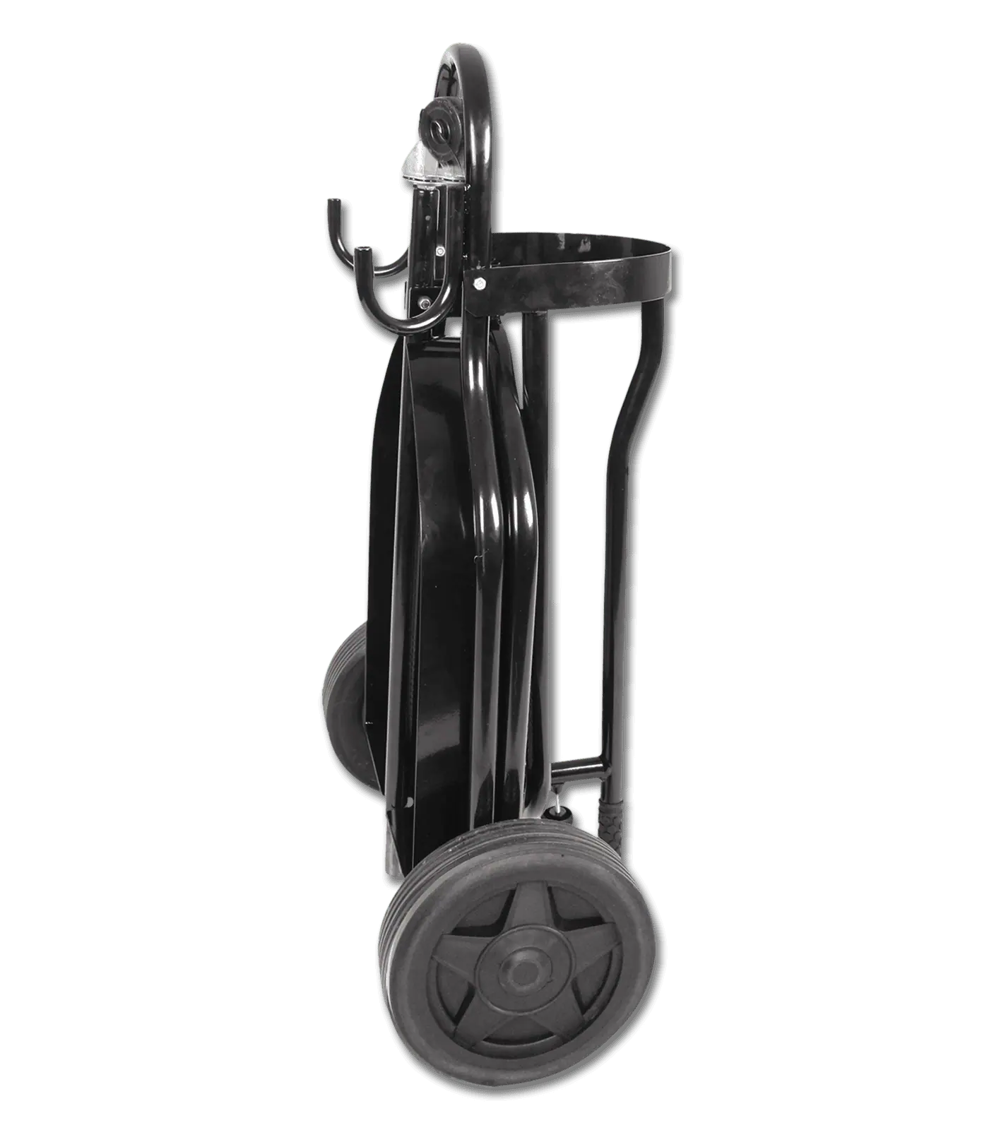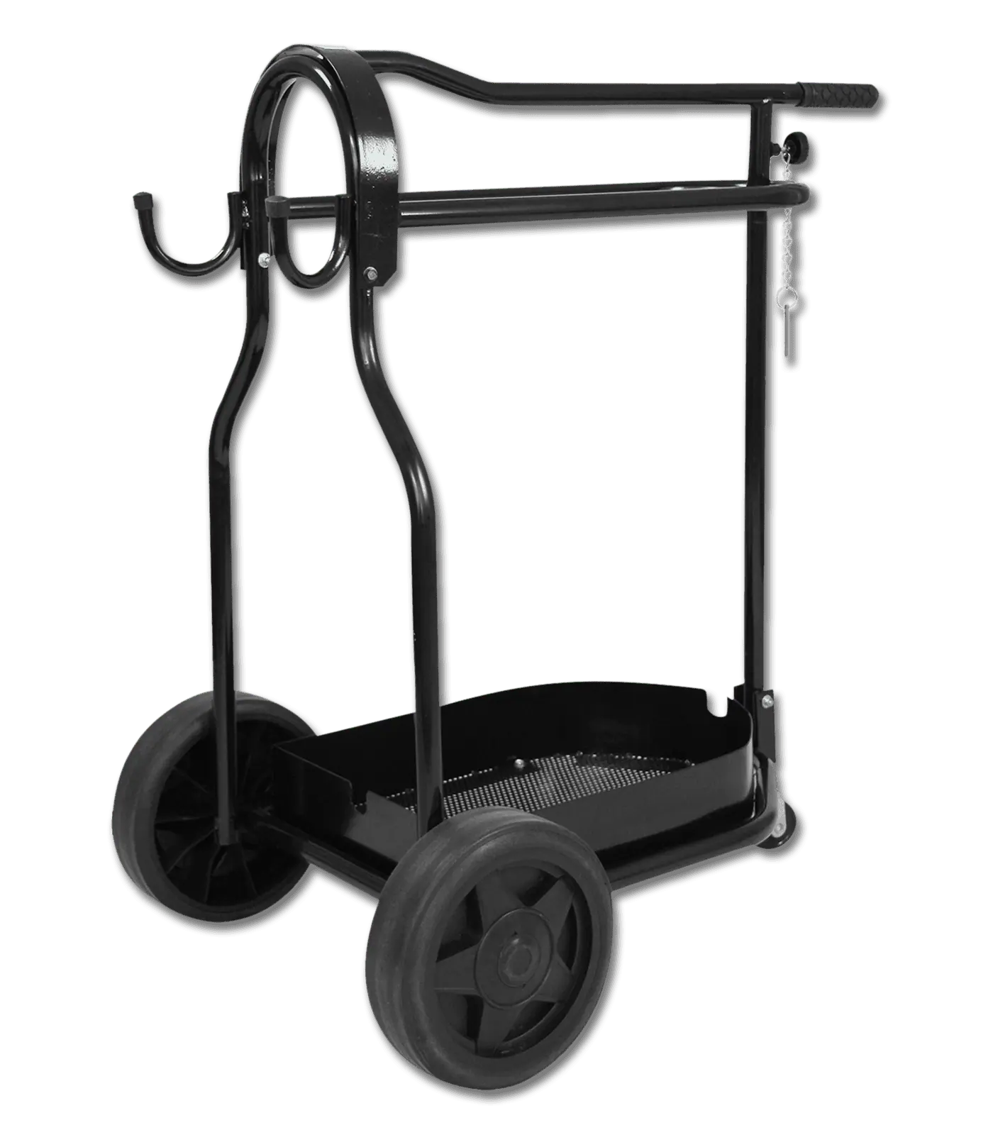 Hardwearing stable carry with a useful basket that will stow all kinds of equipment. Features 2 hooks to hang bridle, etc. Easy pushing and steering thanks to 2 broad plastic wheels and a guide pulley. Can be folded away when not needed. Suitable for most kinds of saddles.