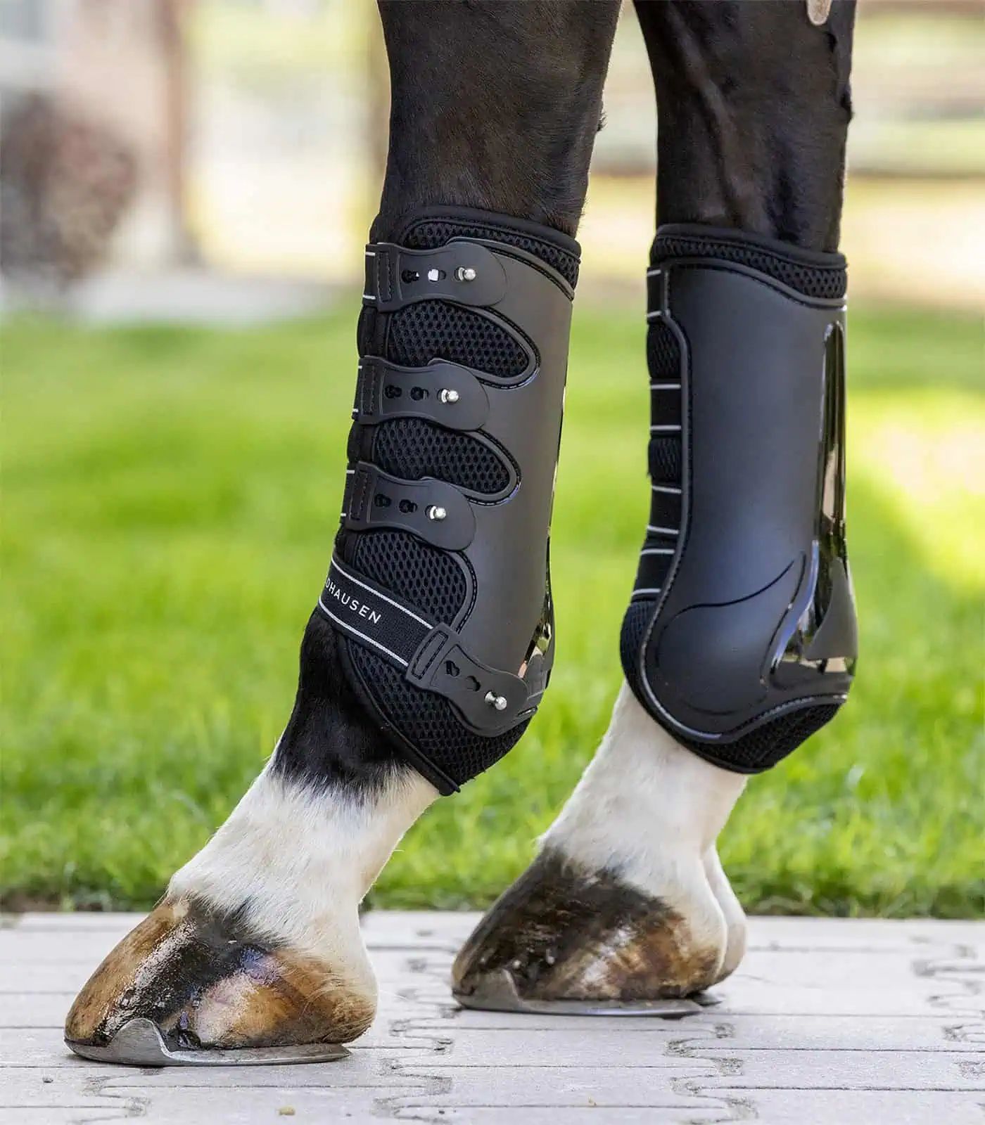 Anatomically shaped outer shell. Shock-absorbing and particularly breathable due to a special mesh-padding. Adjustable in three places by means of practical speedy button fastening with elastic straps for optimum adjustment to the horse"s leg. Pair