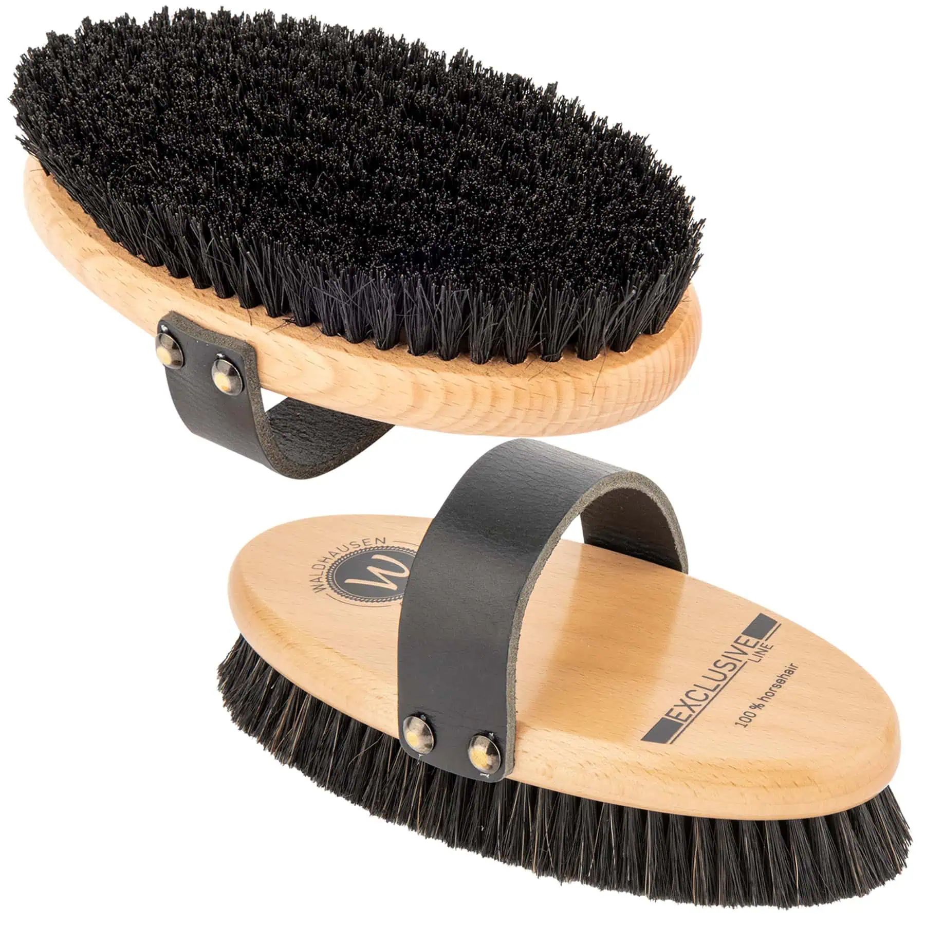 This medium-sized body brush combines an outstanding grooming result with a pleasant TLC session for the horse and is indispensable for daily grooming. The densely worked horsehair in premium quality from the tail of the horse also remove even the last speck of dust and hence produce a wonderful gleam to the coat. By using natural materials, the coat is also perfectly conditioned as the former guarantee a moisturizing effect. Natural materials do not produce static.