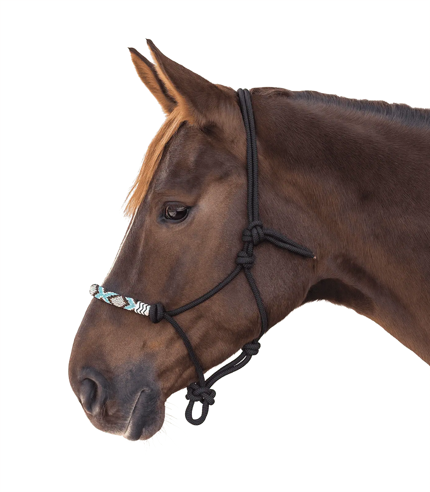 Chic knotted halter with double headpiece and double noseband. Thickness of the cord 8 mm. Beautiful design with pearls on the noseband.