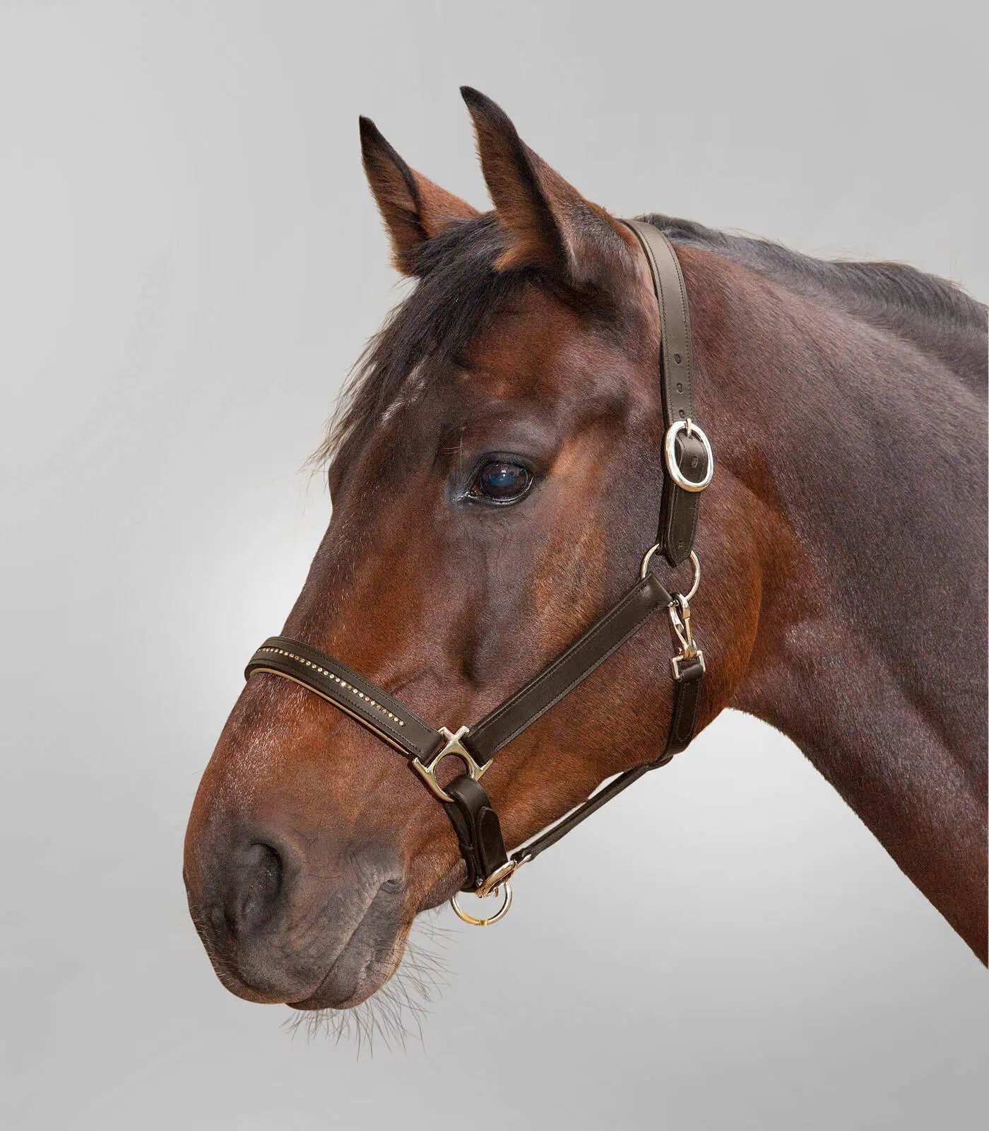Hard wearing leather halter featuring a lined noseband and poll strap. Multi adjustable on neck and nose. Silver coloured fittings (black), brass coloured fittings (brown).