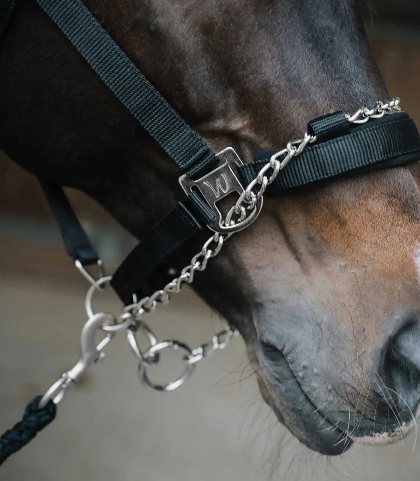 Quality halter with integrated chain on the noseband. The lead rope can be attached to the halter ring and also the chain ring to provide a minimal effect and a strong effect respectively.