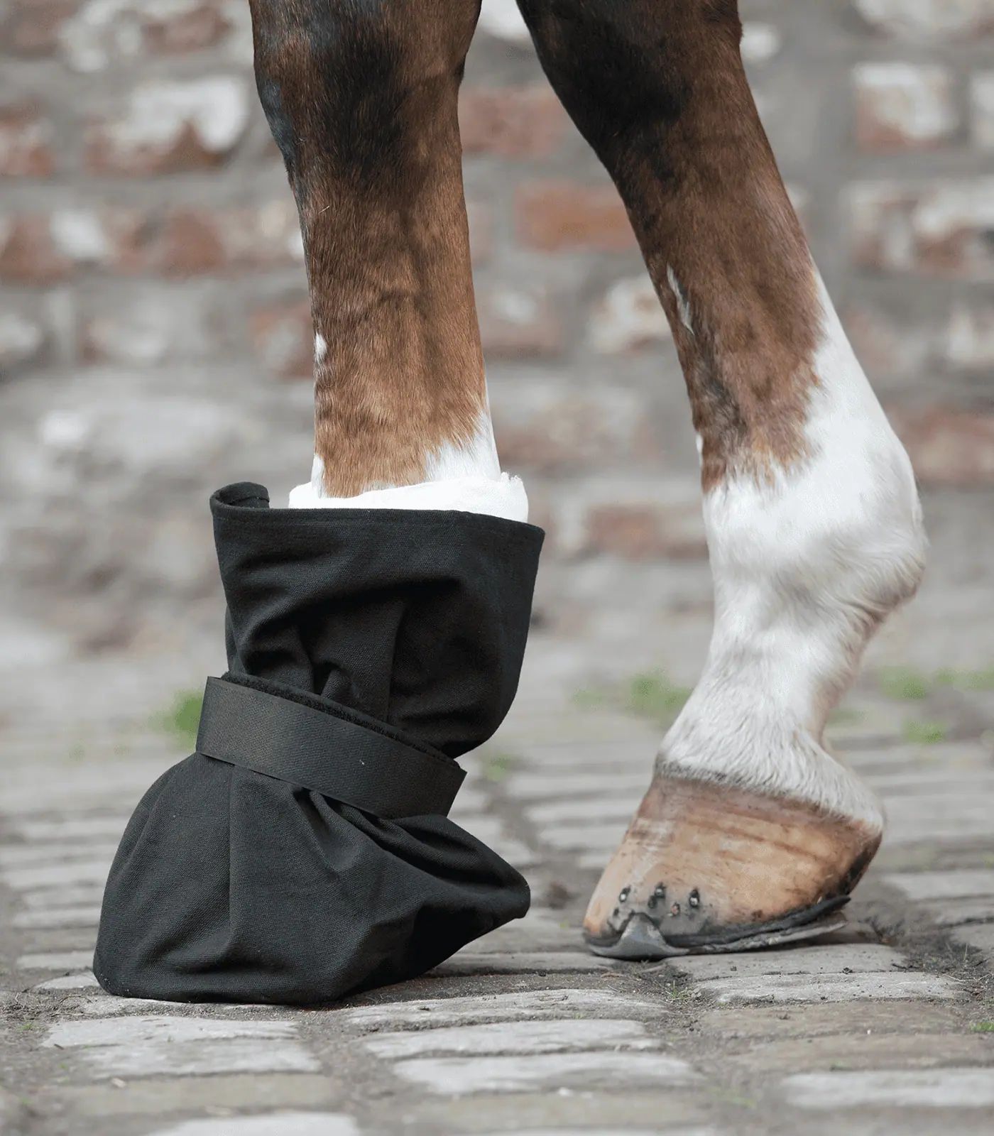 Hardwearing canvas material and a PVC sole for protecting hoof dressings. Easy to close with a touch tape strap. Washable.