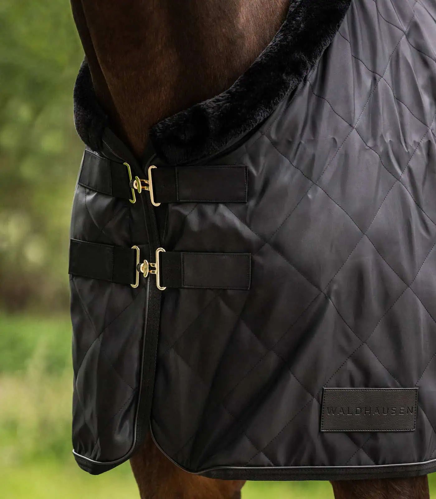 High quality travelling rug, lined with artificial rabbit fur for cold winter days. The rabbit fur optimally stores the horse"s body heat, is particularly soft and prevents rubbing. The rug is finished off with an artificial fur collar. With length-adjustable and detachable crossover straps, double T-front fastener and metal eyelets for a tail strap to be attached.