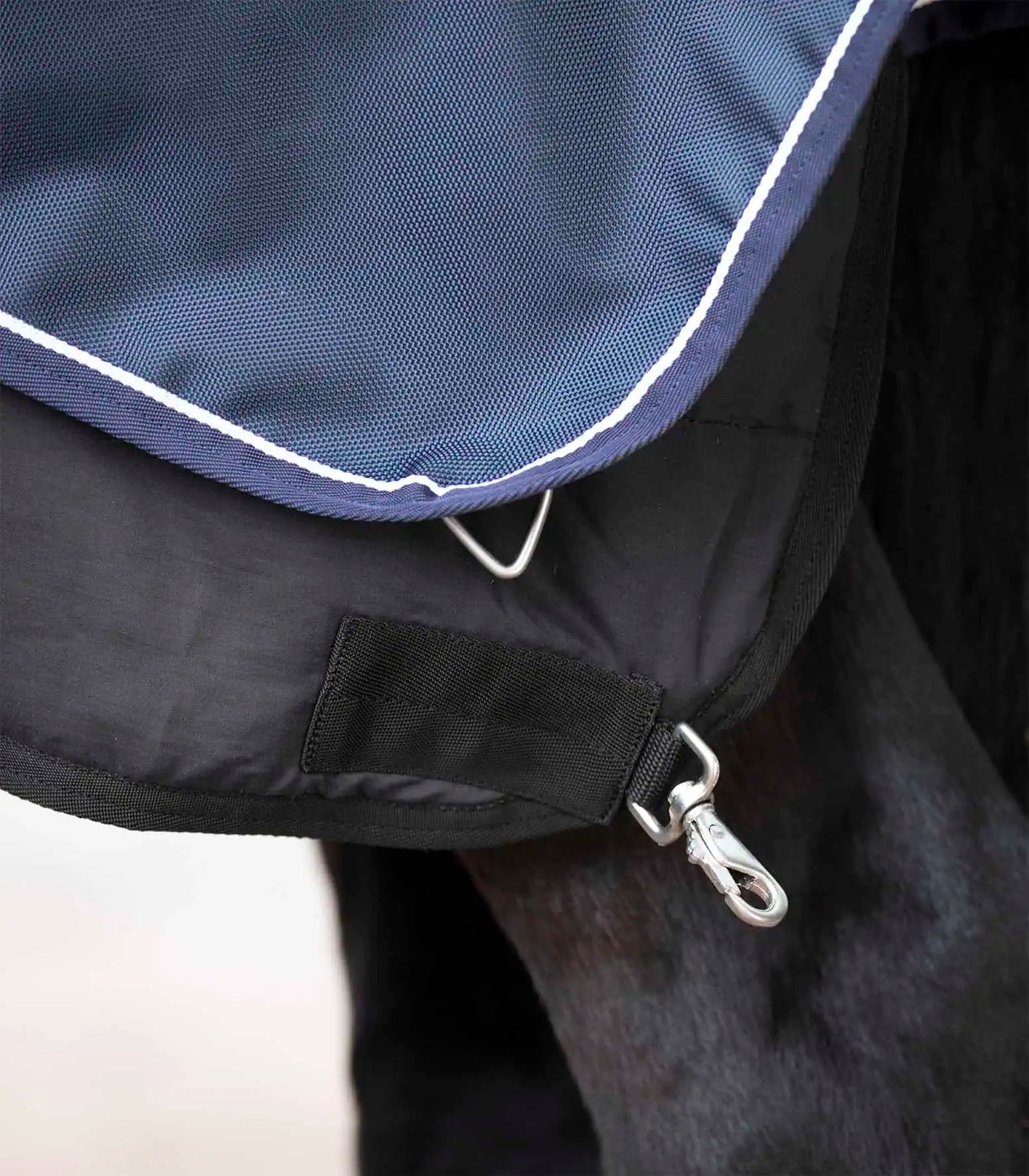 Warming, breathable underrug with 200 g/m² thermofill. The outer material has a silicone print in the back area which helps prevent the rug on top from slipping. Simple T-chest fastening with elastic and touch tape cover. 2 elastic touch tape straps in both the shoulder area and hind end for easy attachment to all Waldhausen turnout rugs.