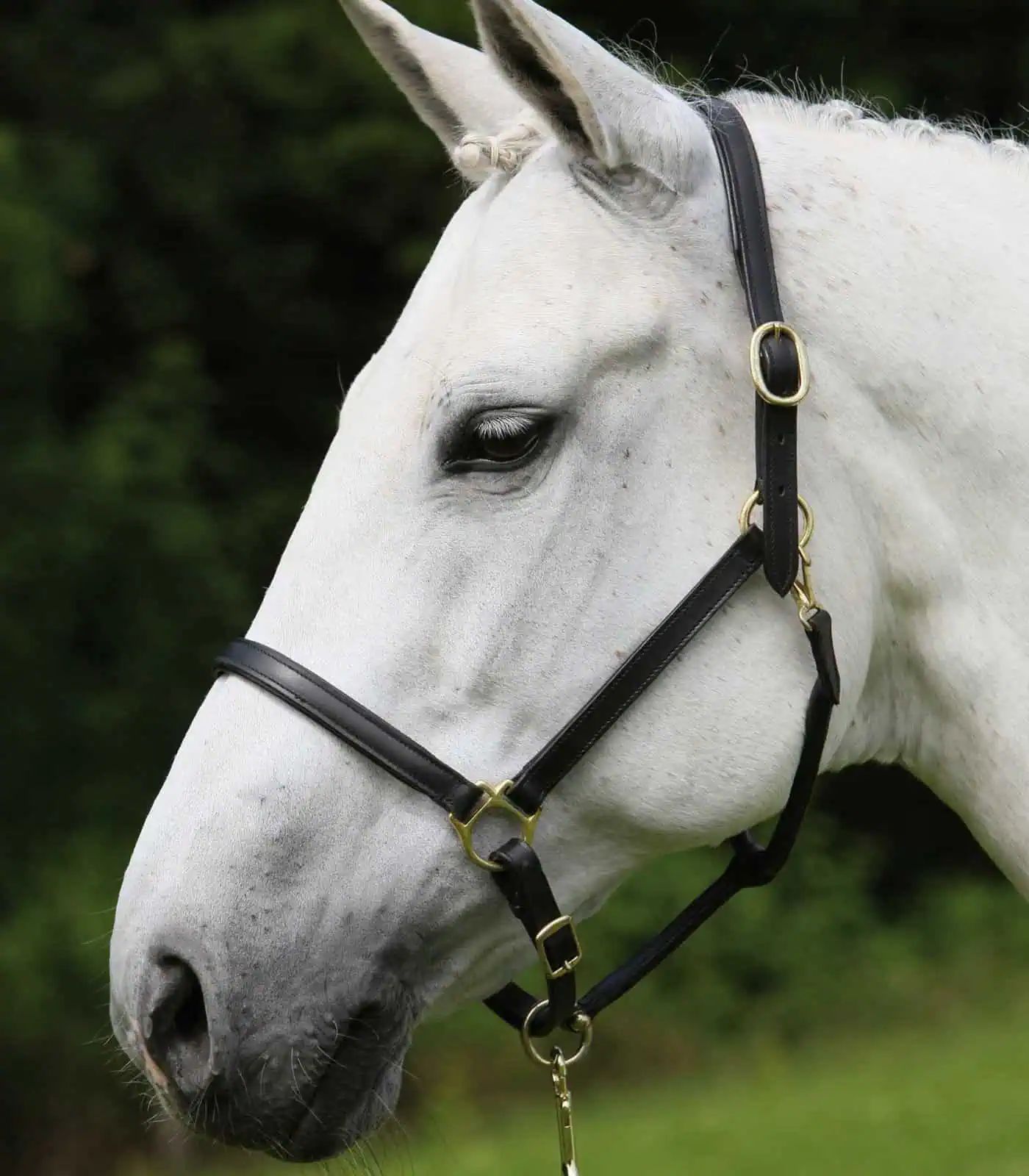 Hard wearing leather halter featuring a padded nose- and neck strap. Brass coated fittings and multi adjustable at the neck- and curb strap.