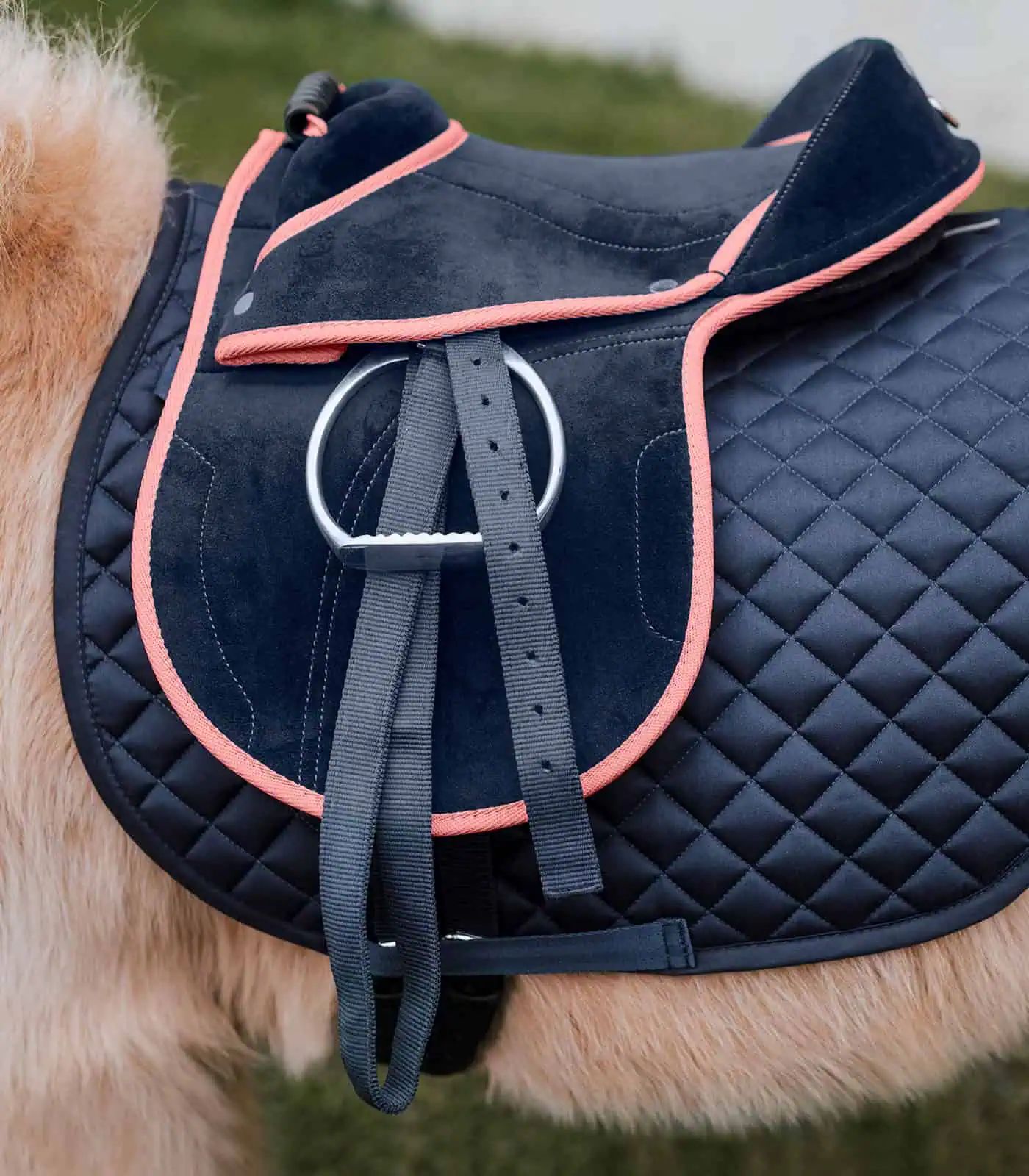 Lightweight riding pad for little riders, with glitter logo and pink binding. Softly padded, front and back cut higher for a good seat. Grippy, non-slip, grab strap for holding on. Variable gullet by means of repositionable pads. Adjustable knee rolls with touch tape at front, crupper ring, hard-wearing nylon straps. Supplied with grab strap, girth, stirrup leathers and stirrups.