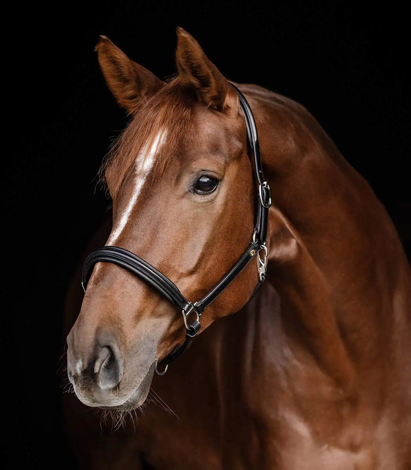 Elegant leather halter with softly padded noseband and headpiece. Headpiece adjustable on both sides and easily adjustable chin strap.