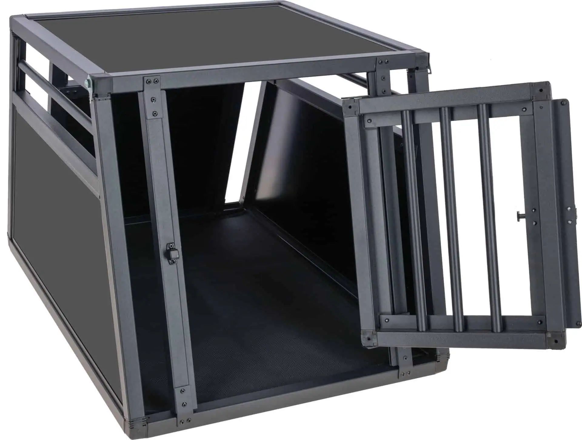 Additionally, aluminum bars in the door and upper area ensure excellent air circulation and visibility. An anti-slip thermal mat made of synthetic rubber inside provides extra comfort. The box features a door with a quick-lock system as well as smooth surfaces that allow for easy cleaning. The easy and quick assembly makes the Aluminium Transport Box Vacation particularly user-friendly.