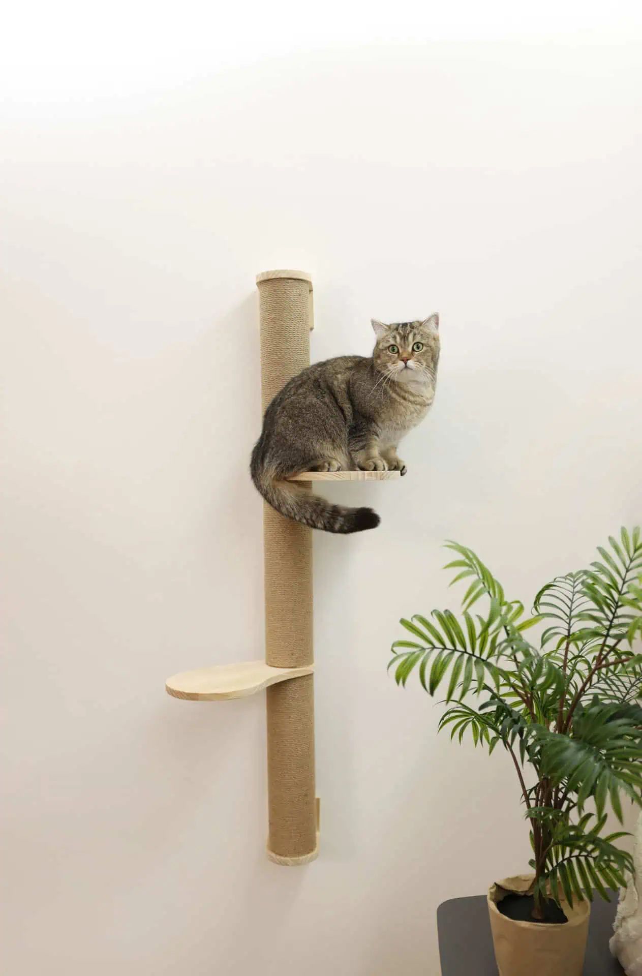 The Scratching Post Timber is the perfect solution for cats that love to climb, play, and sharpen their claws. This multifunctional product not only provides your cat with the opportunity to romp around but also offers a cozy spot to rest and keep watch. Equipped with two platforms, this climbing post for vertical wall mounting is also suitable for two cats and can be ideally integrated into existing cat climbing walls or used as an aid to reach higher levels.