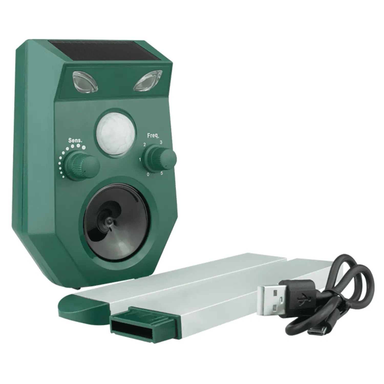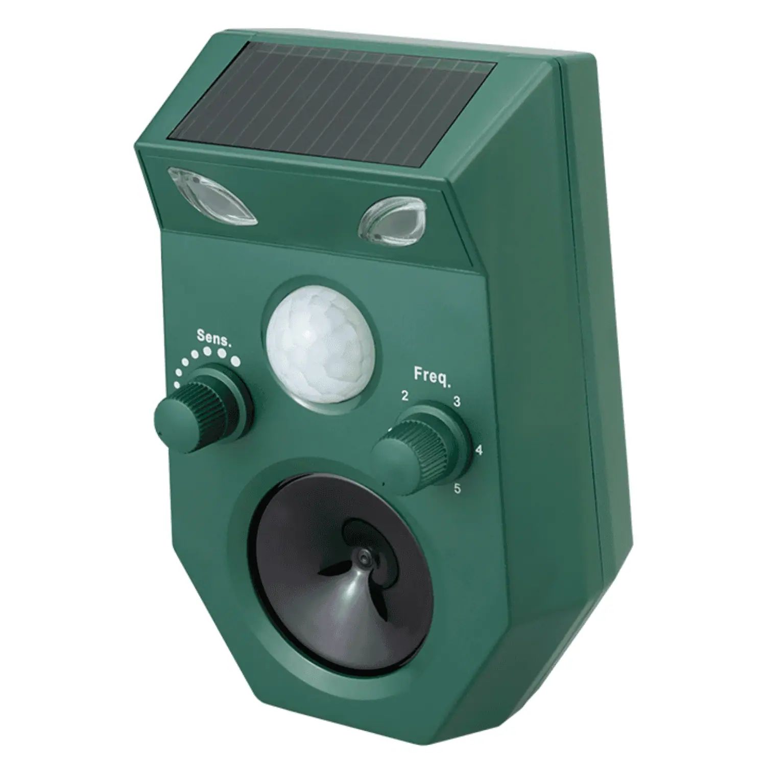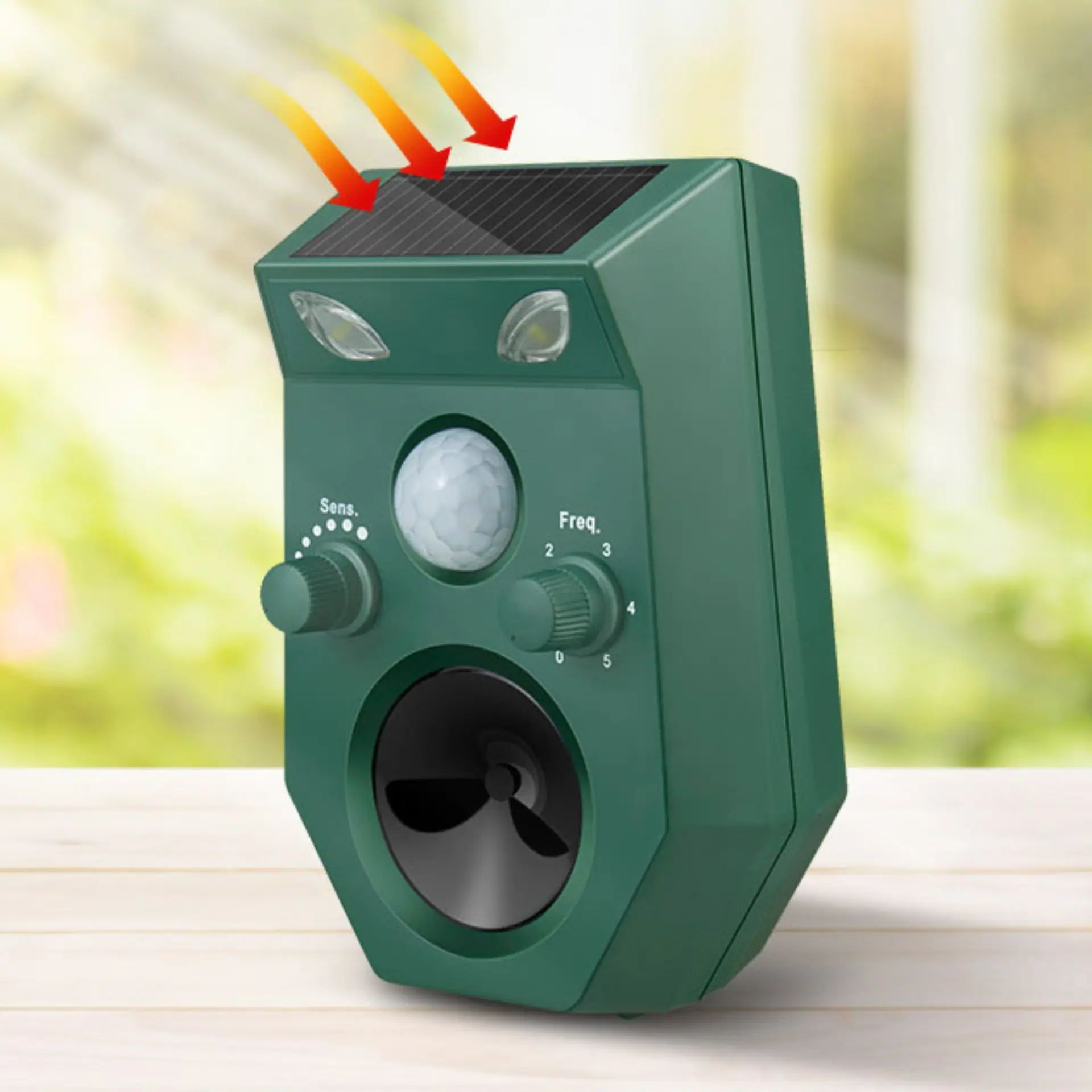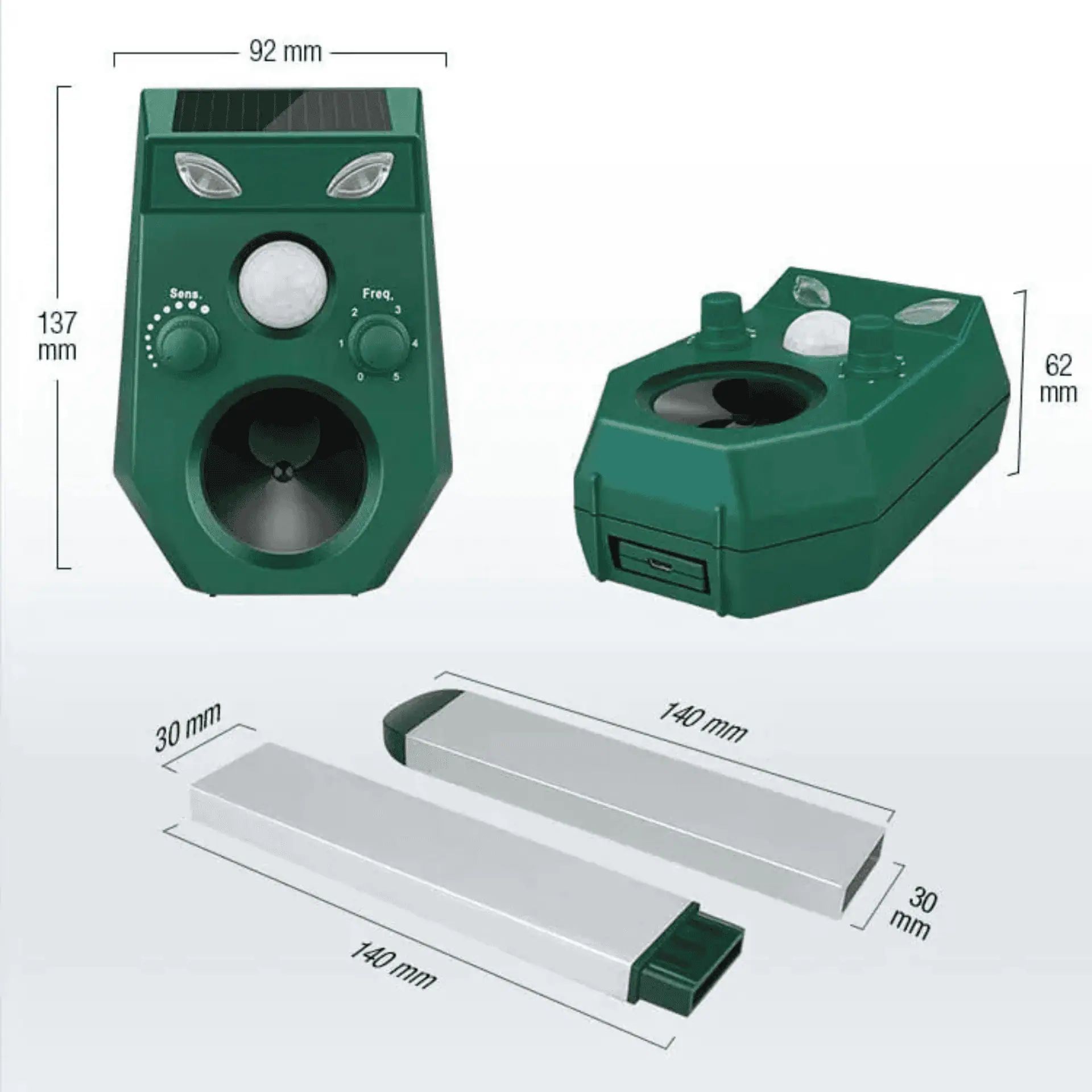 The repeller emits ultrasound waves and flashing lights that are activated when an animal enters the area. These signals effectively repel the animals without harming them.