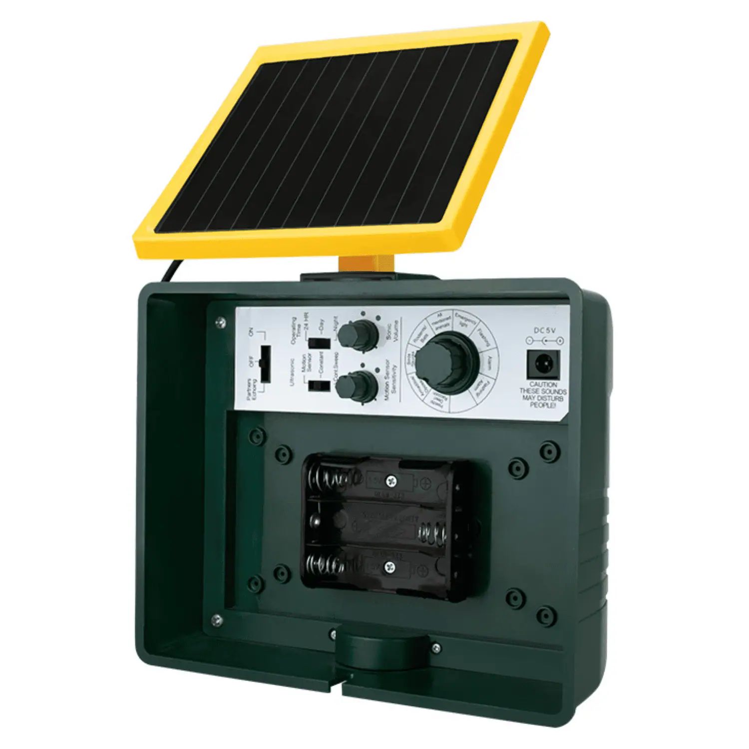 The Animal Repeller is primarily powered by solar energy and stores the energy in rechargeable batteries. It can also be charged with a 6V adapter.